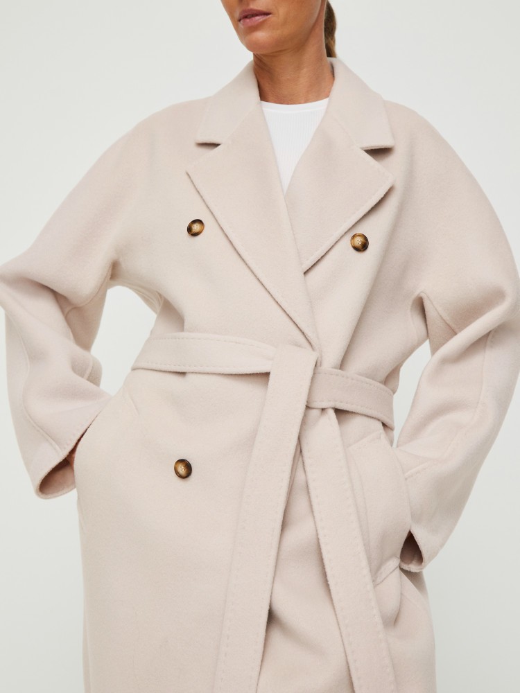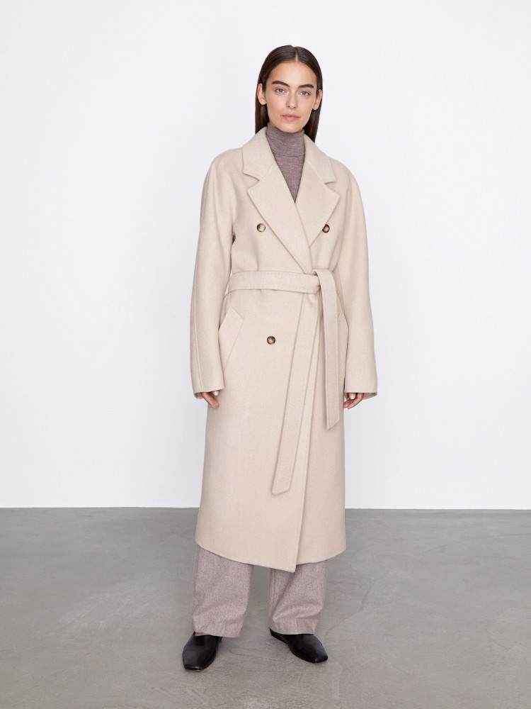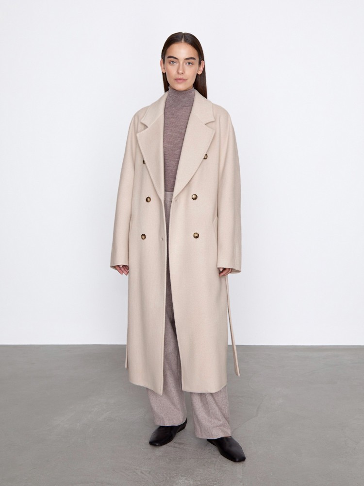 Двубортное пальто с поясом — бестселлер 12 STOREEZ. Прямой силуэт, цельнокроеный рукав, который можно подворачивать на нужную высоту. Два глубоких накладных кармана, съемный пояс и застежка на крупные пуговицы. Пальто выполнено из австралийской шерсти по технологии спаянных швов, которую используют премиальные марки: у пальто нет подкладки, и с изнаночной стороны швы выглядят так же, как и с лицевой. Для пальто мы используем супертонкую мериносовую шерсть — приятную к телу, легкую, мягкую и теплую. Благодаря универсальному крою пальто остается вне трендов, и его можно сделать частью образа в любом стиле, от классики до спорта.