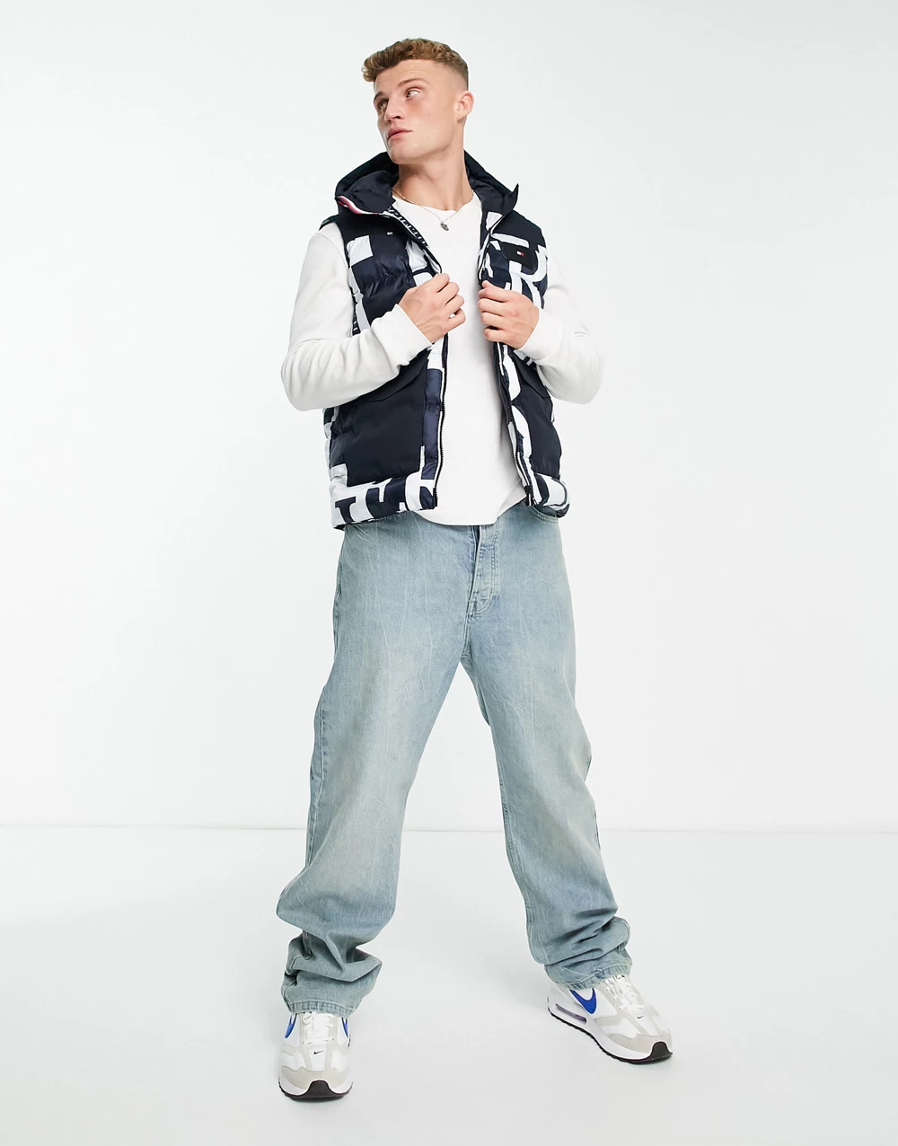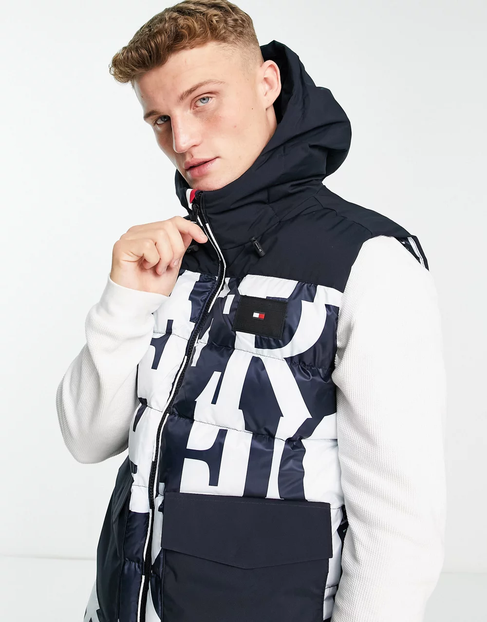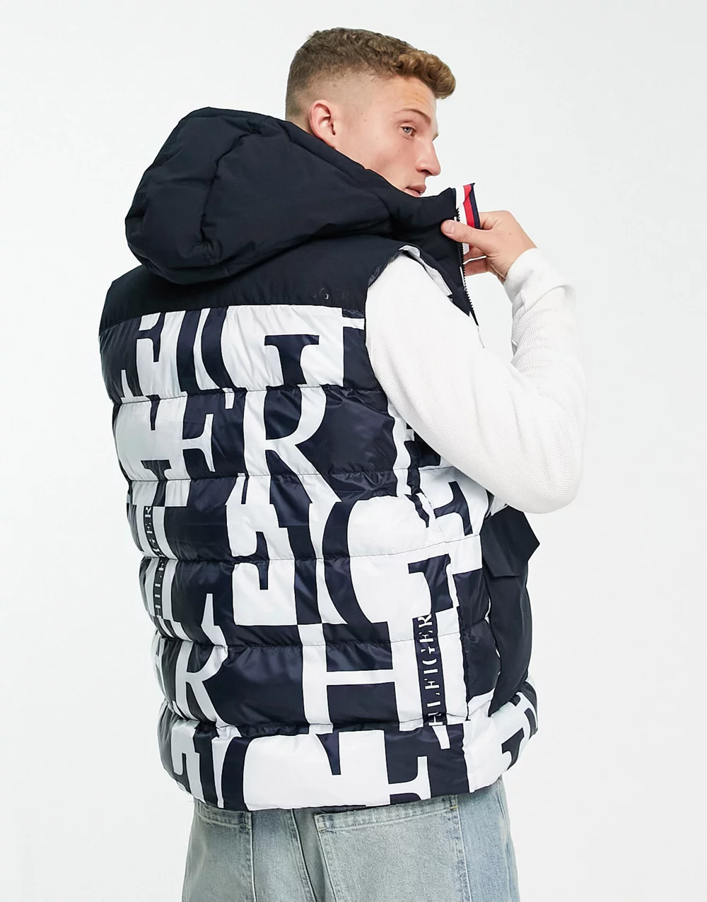 - Tommy Hilfiger padded gilet in blue Hilfiger print