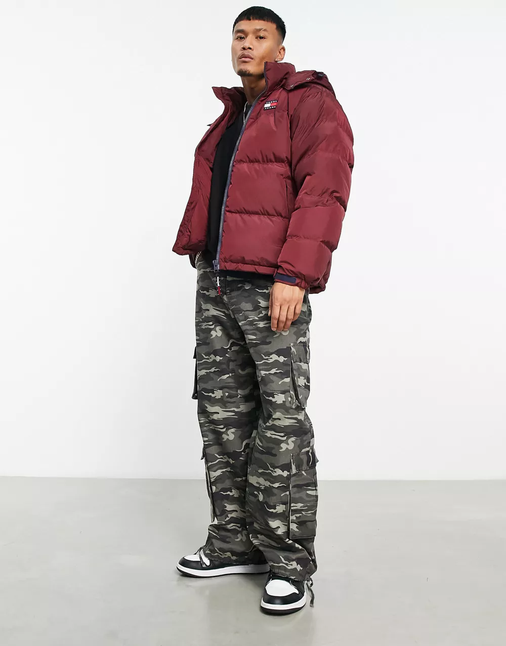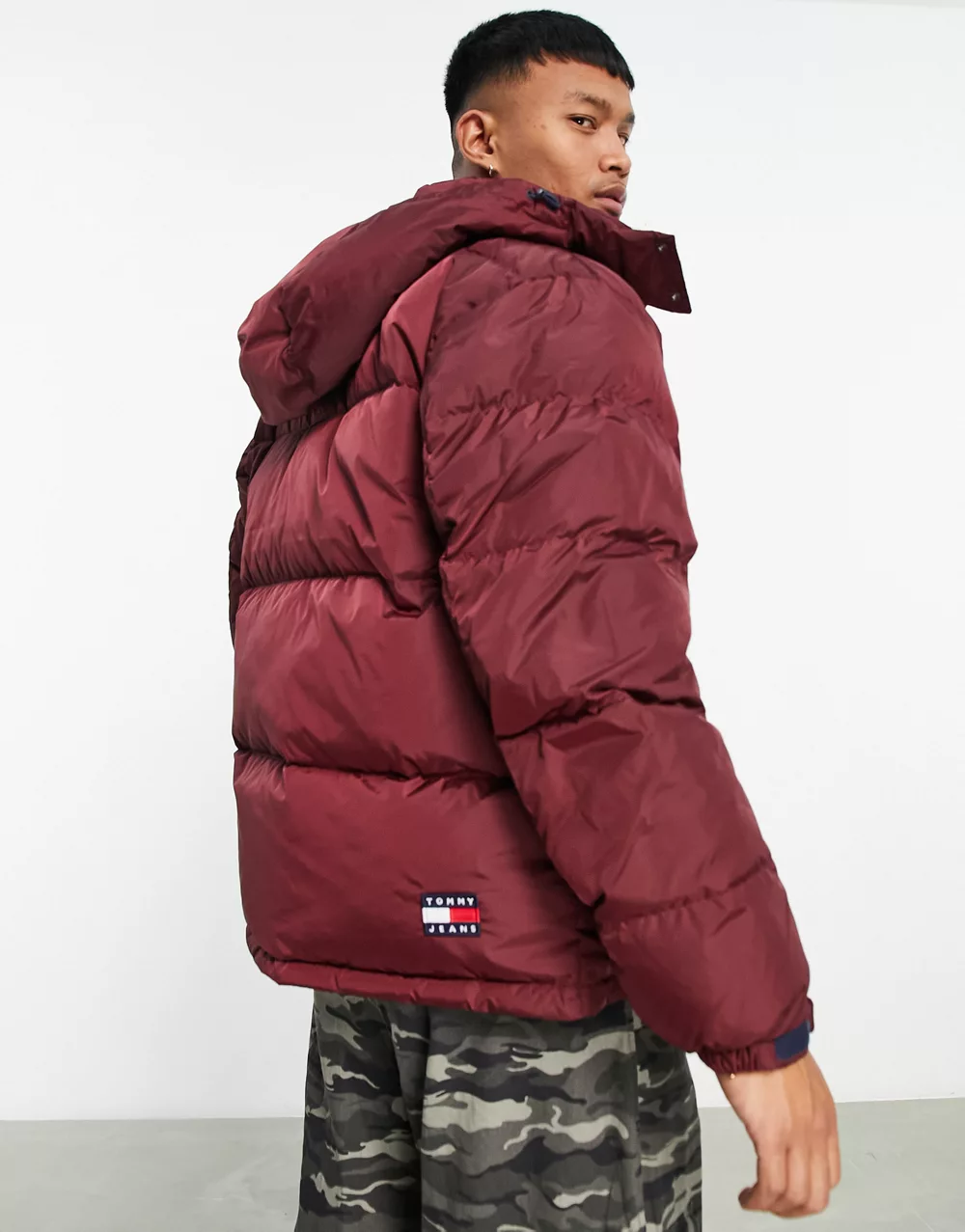- Tommy Jeans alaska flag logo detatchable hood down puffer jacket in burgundy