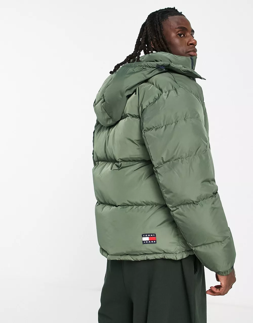 - Tommy Jeans alaska flag logo detatchable hood down puffer jacket in green