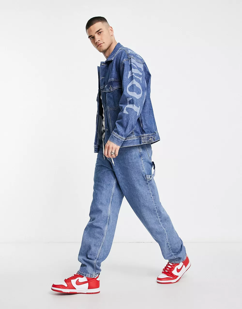 - Tommy Jeans arm logo oversized denim trucker jacket in mid wash