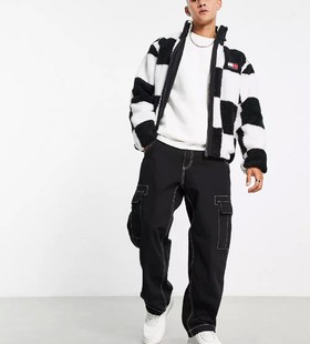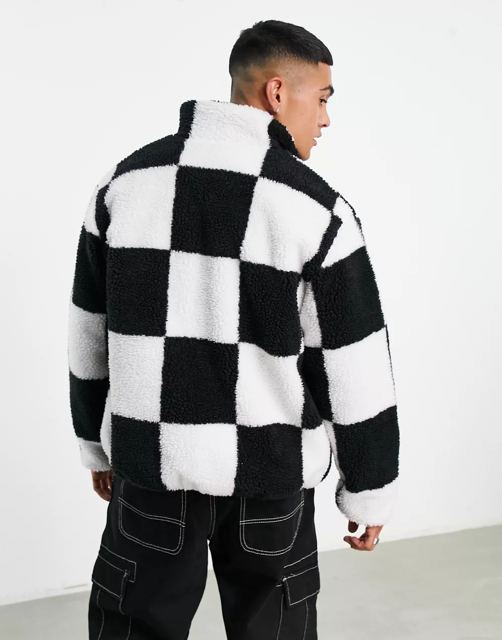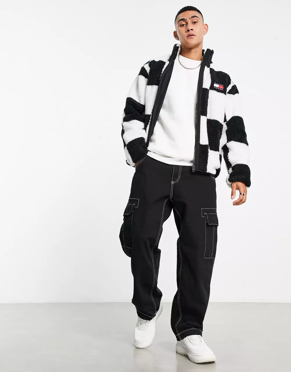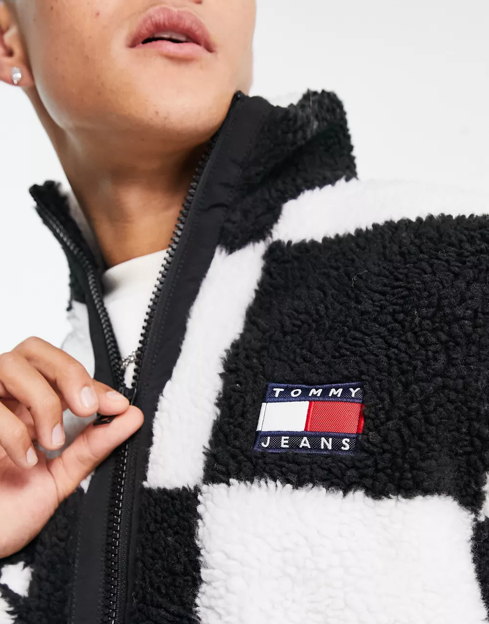 - Tommy Jeans checkerboard print sherpa jacket in off white/black