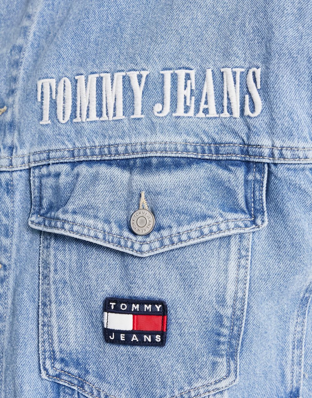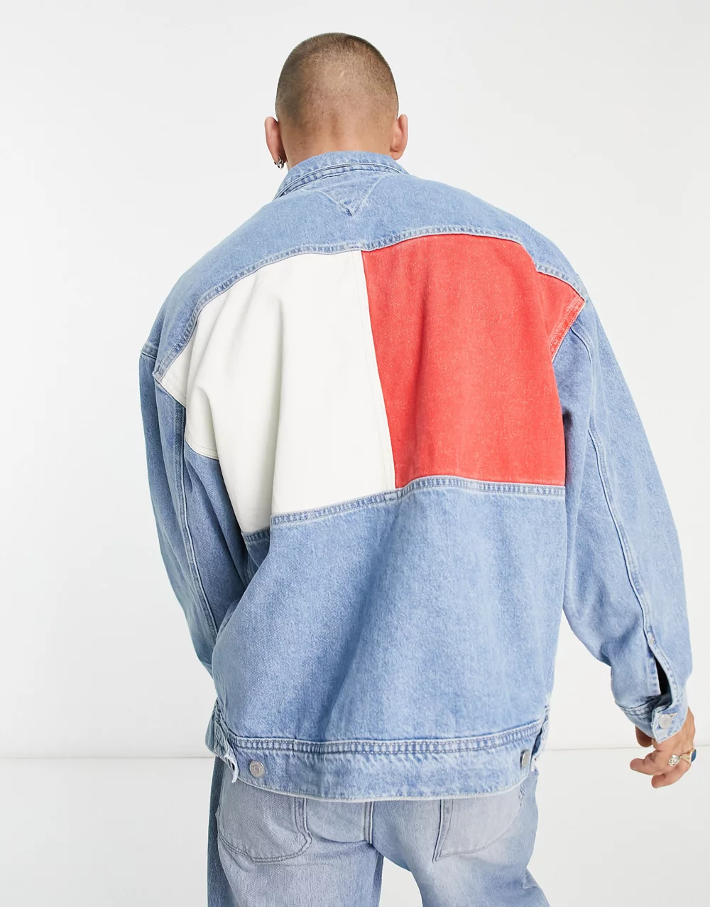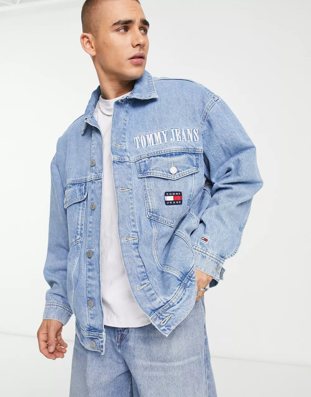 - Tommy Jeans cotton back flag oversized denim trucker jacket in light wash
