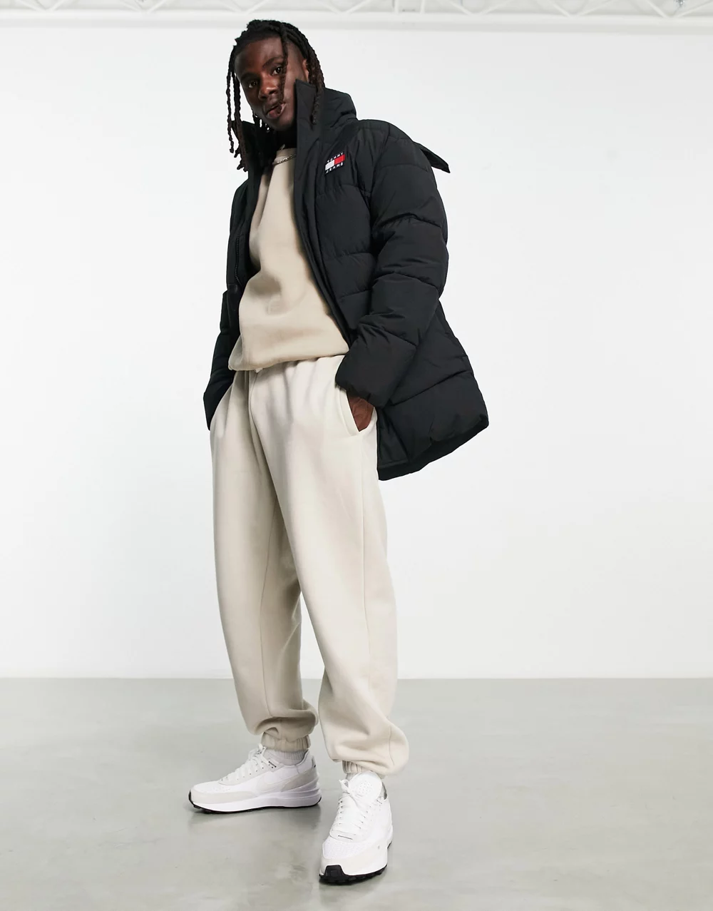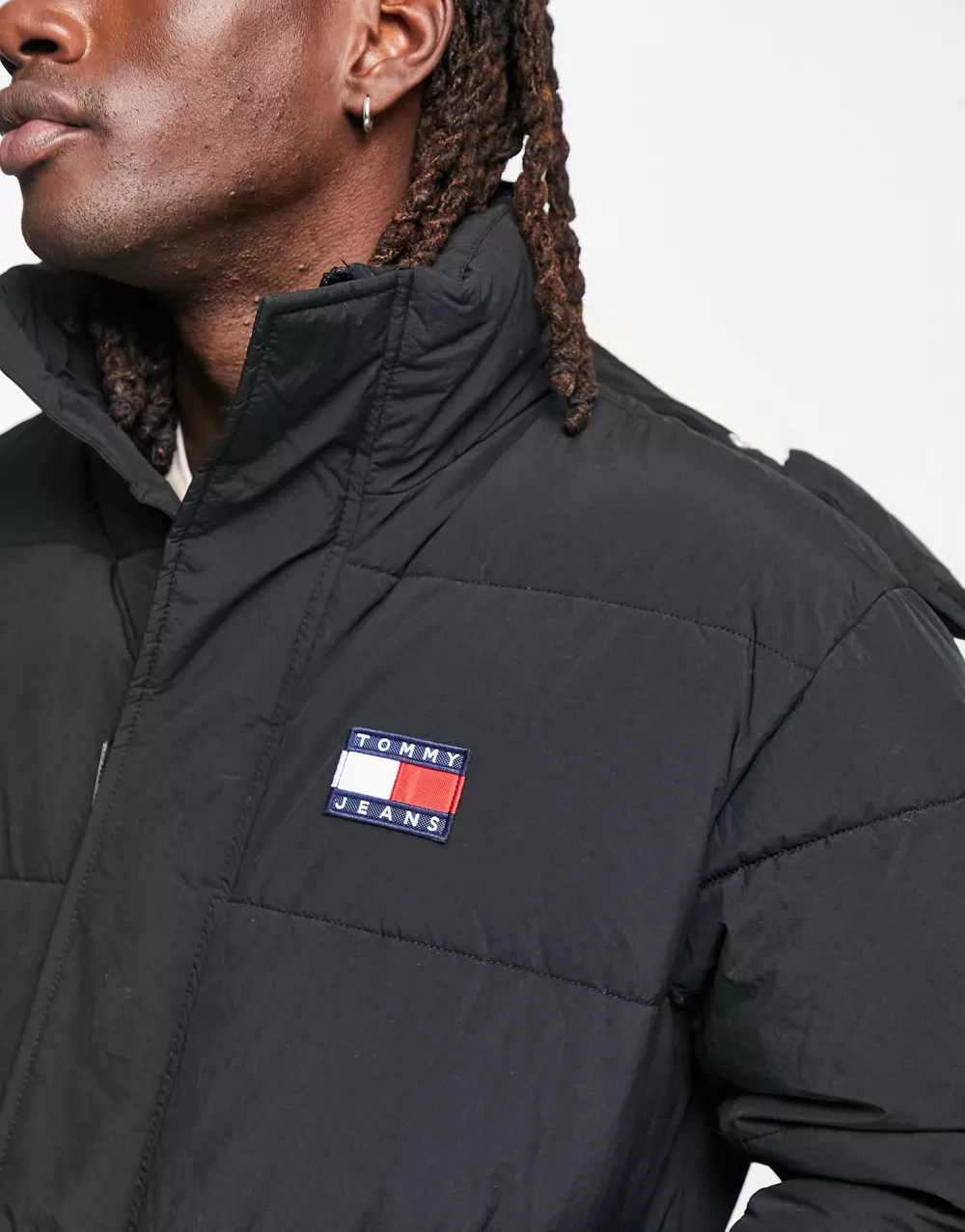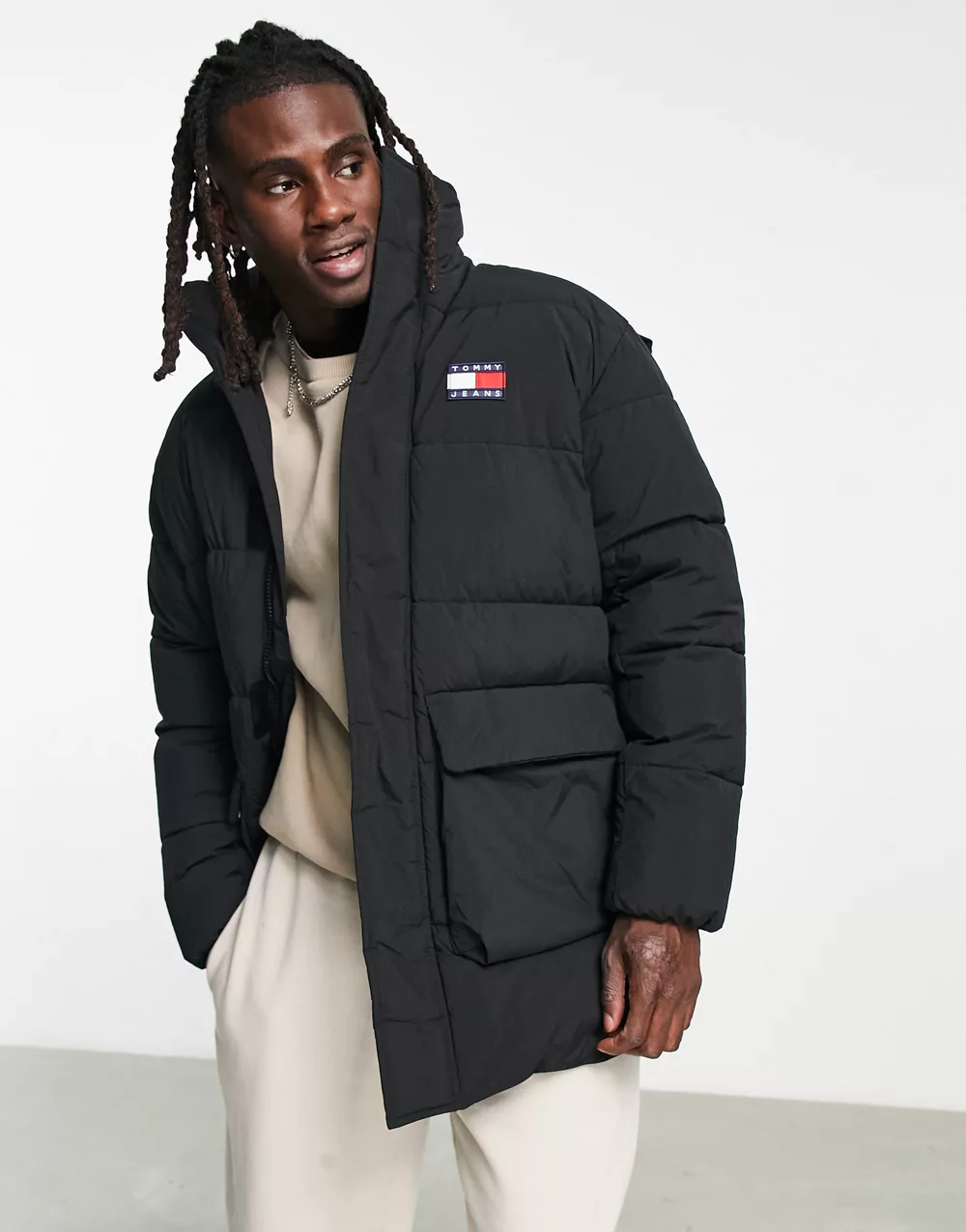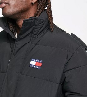 - Tommy Jeans nylon badge logo multi pocket hooded puffer parka coat in black - BLACK