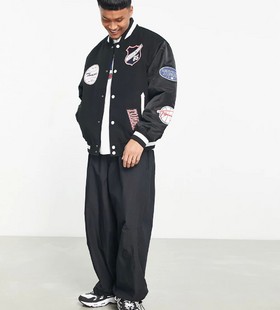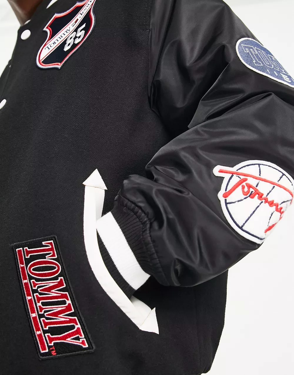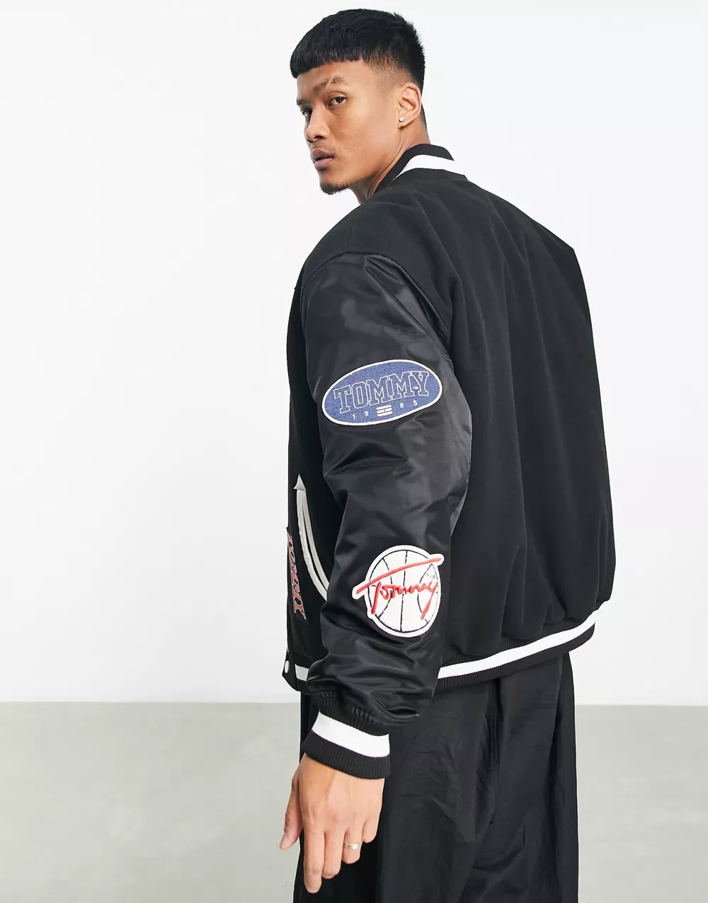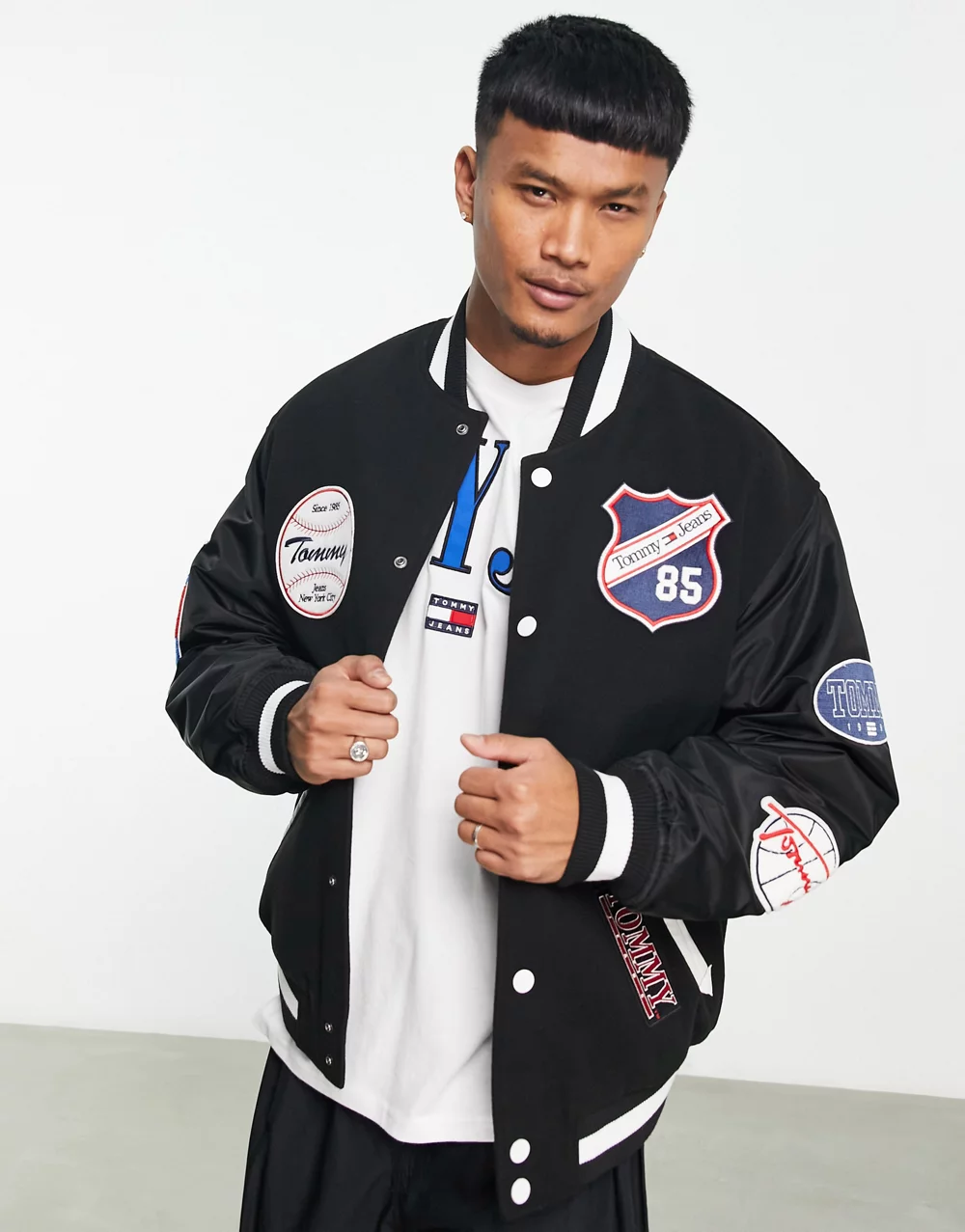 - Tommy Jeans varsity badge letterman bomber jacket in black