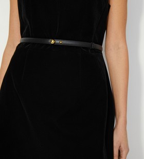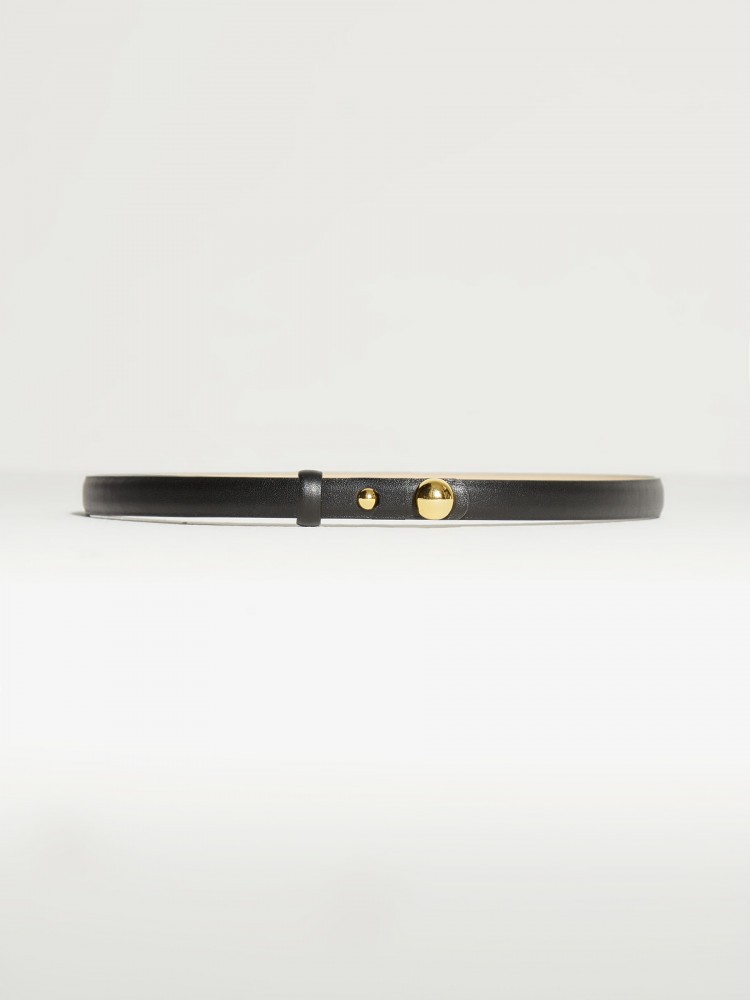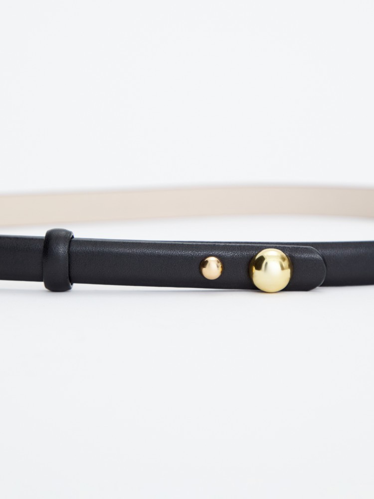 Ремень из гладкой кожи. Изящный аксессуар на талию с застежкой на кобурную кнопку и декоративной деталью в виде золотой полусферы. Ремень выполнен из натуральной кожи с приятной на ощупь фактурой, на подкладке из светлой кожи. - Ширина ремня — 1,5 см. - Без дополнительных обработок кожа сохраняет природную мягкость и текстуру, но может окрашивать светлые материалы. Сделано в Китае.