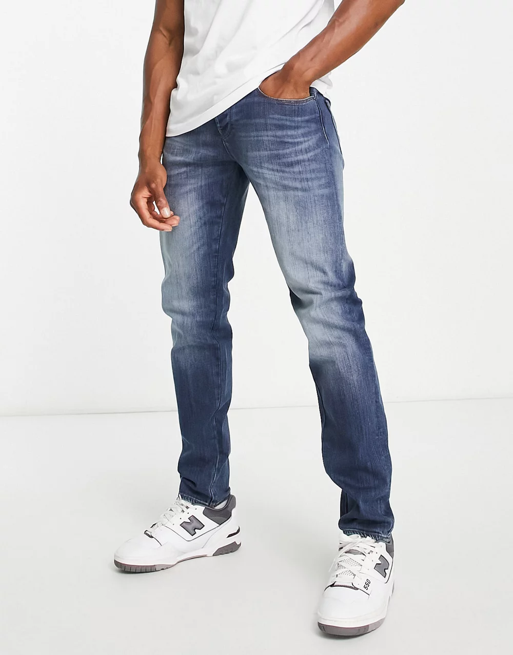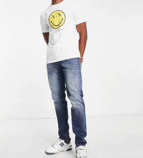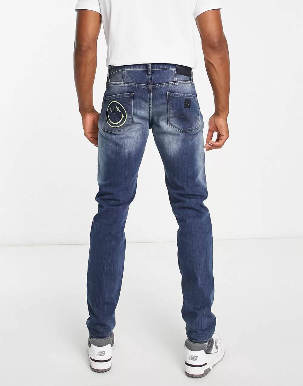 - Armani Exchange x Smiley Face skinny leg jeans in mid wash blue