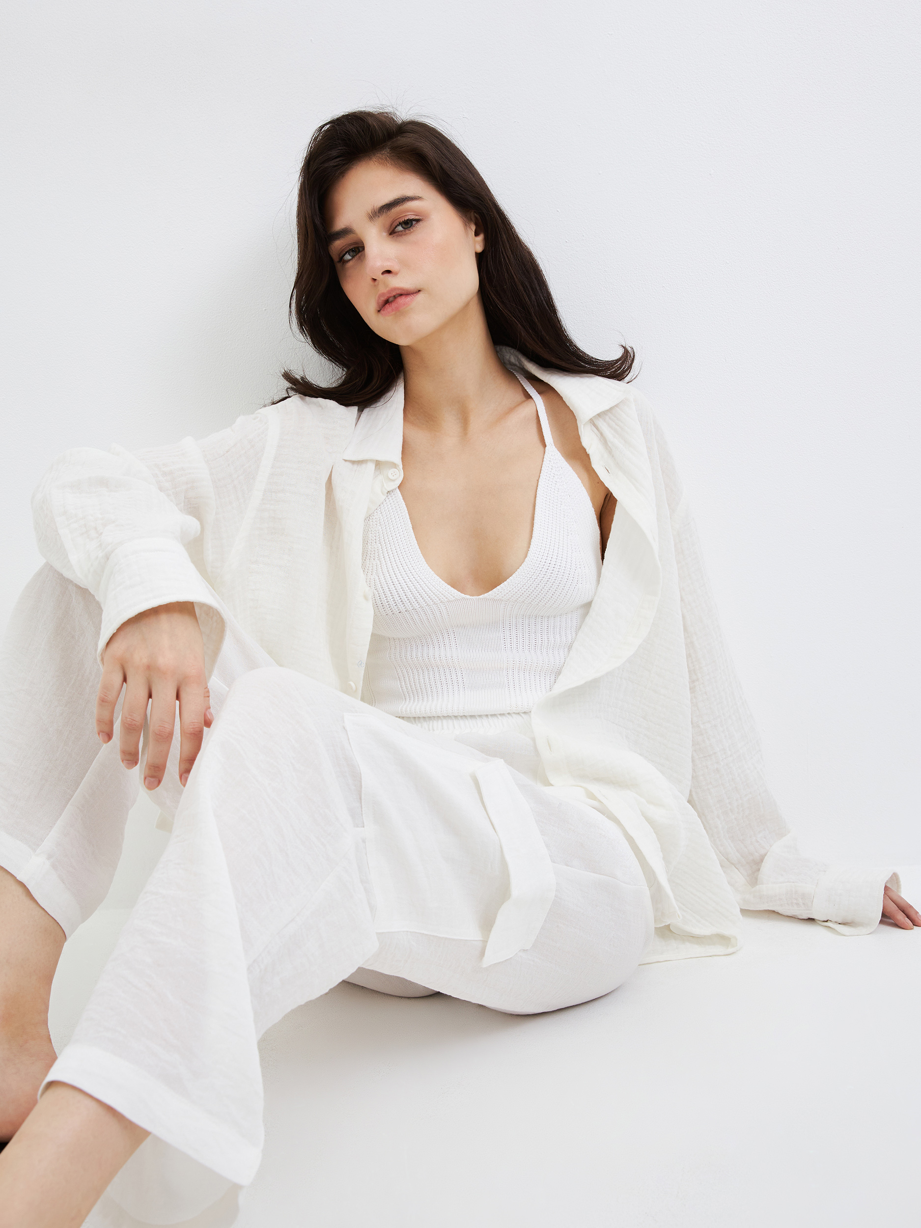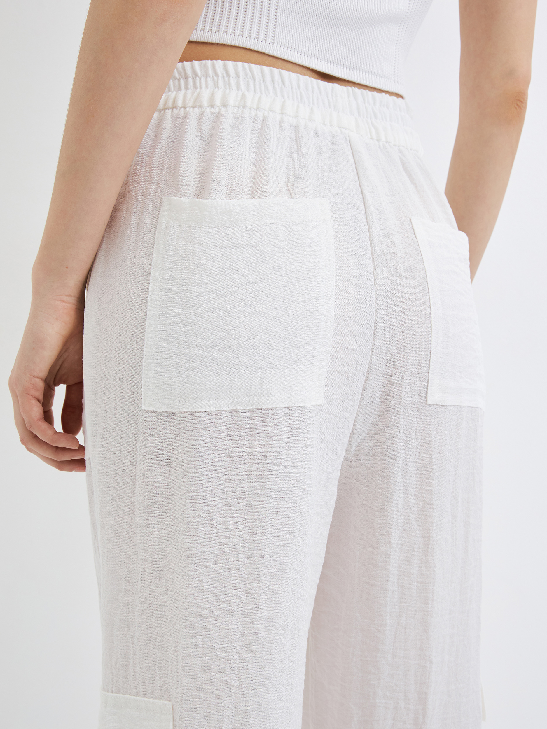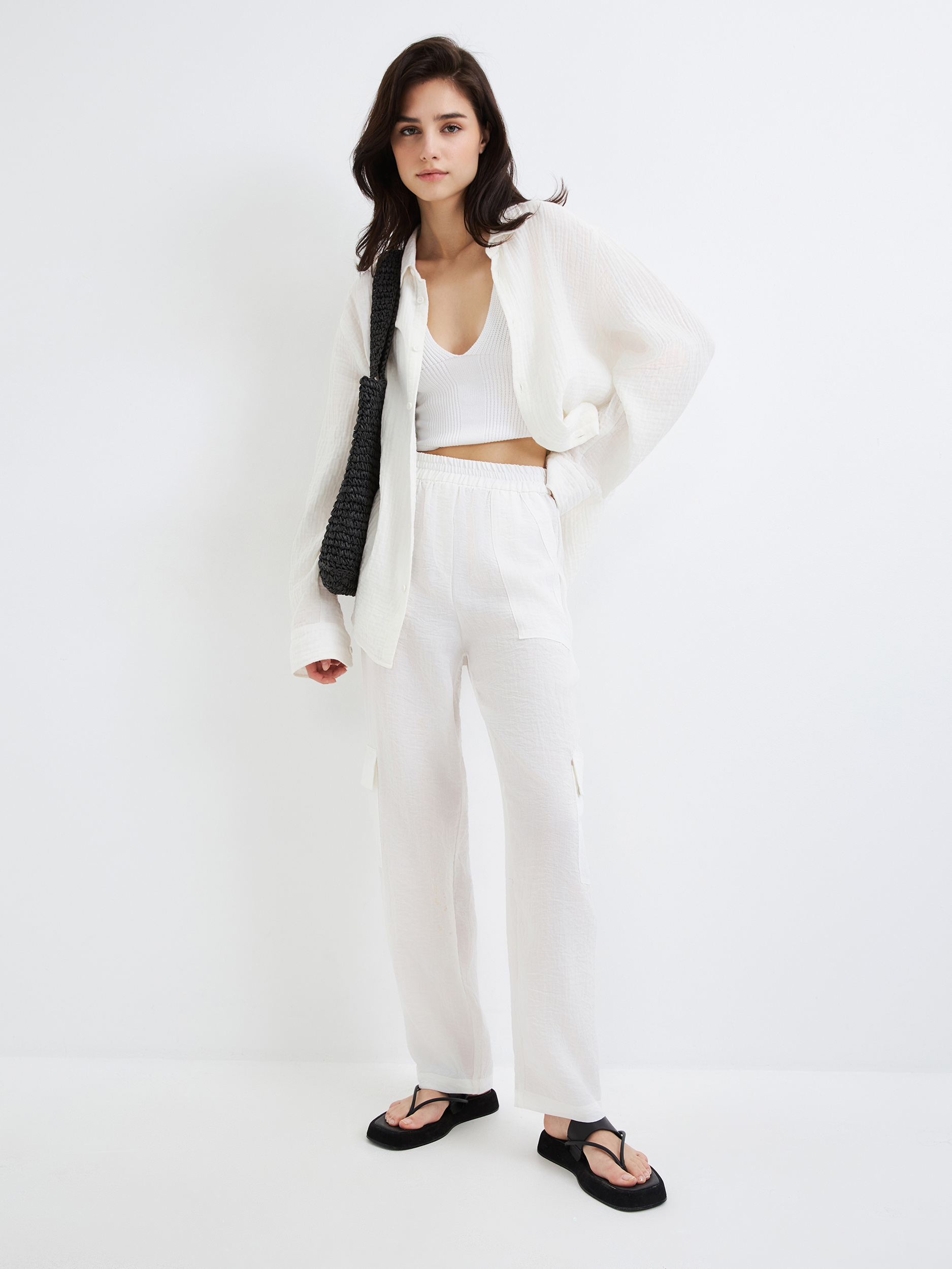 Параметры: Застежка: резинка; Модель брюк: прямые; Тип карманов: накладные; Тип посадки: средняя