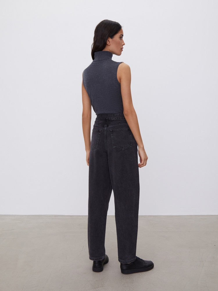 Джинсы на пуговицах. Свободные джинсы с высокой посадкой, объемные в области бедер и слегка зауженные к низу. Застежка на пуговицы, традиционные карманы сзади и два кармана спереди. Особенность джинсов — вытачки, которые придают брючинам необычную форму и делают образ более интересным. Джинсы выполнены из 100% хлопка, мягкого, плотного и долговечного.