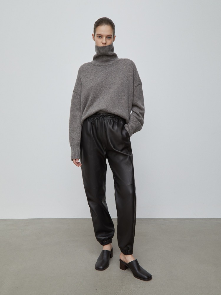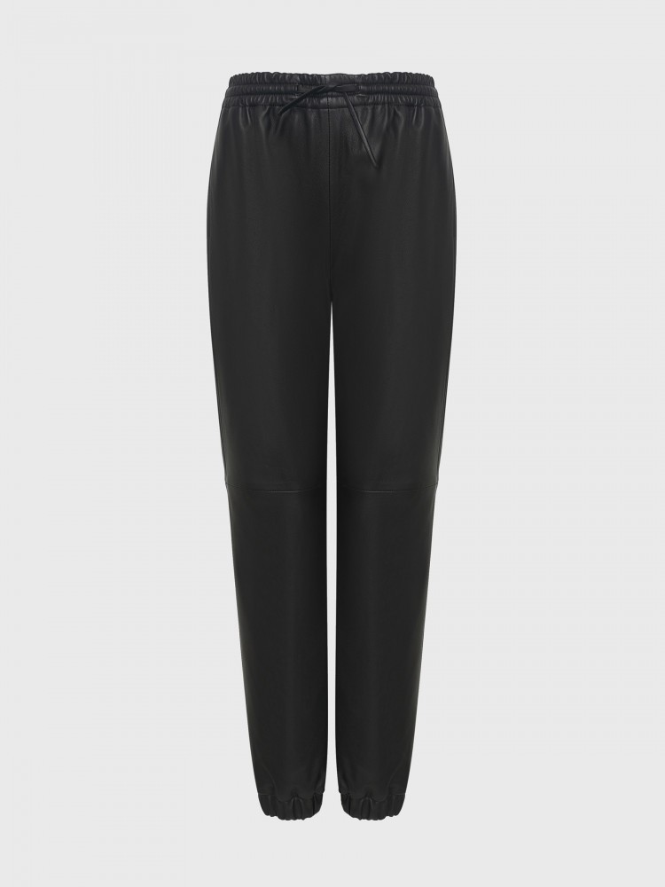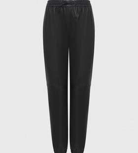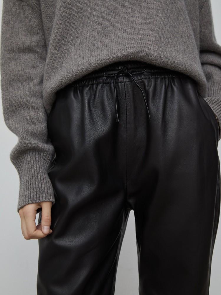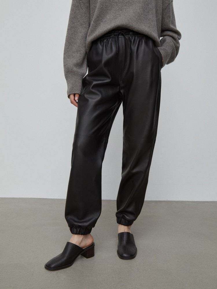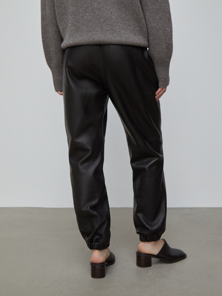 Кожаные джоггеры — универсальная модель, которую можно стилизовать и для вечера, и на каждый день. Широкий эластичный пояс позволяет посадить брюки точно по фигуре, а манжеты — отрегулировать длину. Выполнены из мягкой и тонкой кожи ягненка. Пожалуйста, убедитесь, что брюки сидят свободно в бедрах, это убережет кожу от разрывов. Без подкладки.
