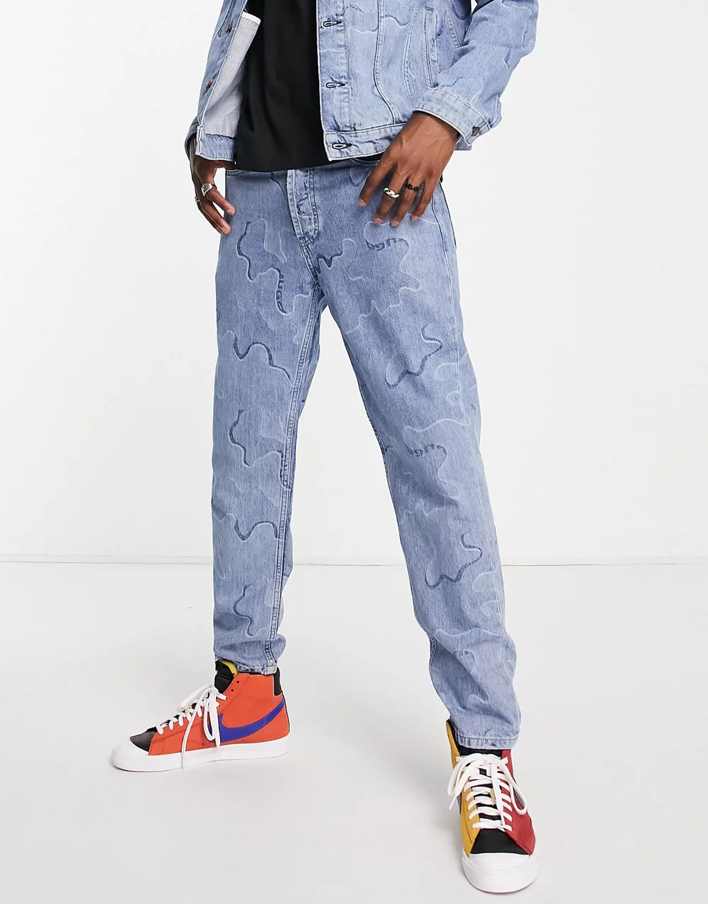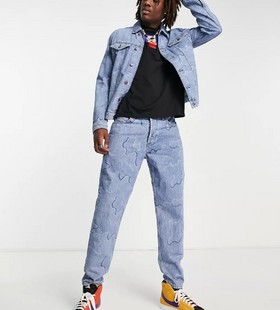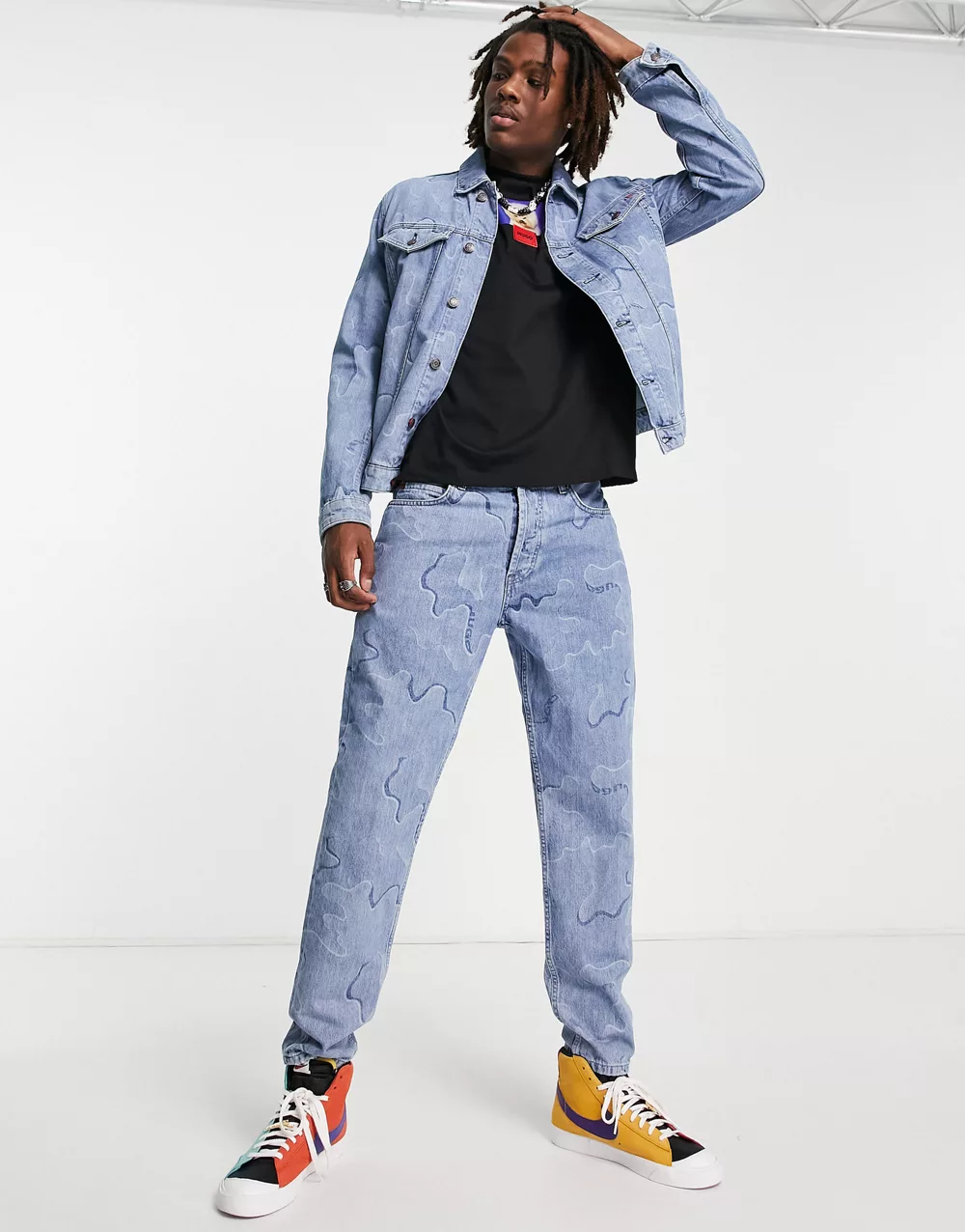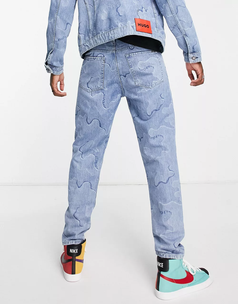 - HUGO 634 tapered fit jeans in bright blue with all over print