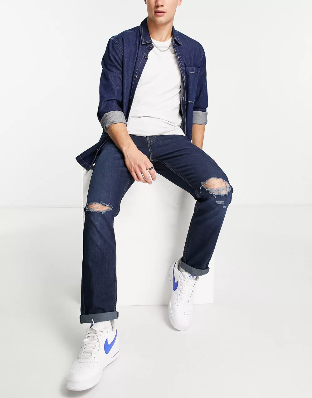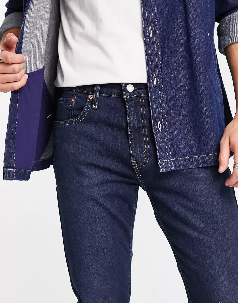 - Levi's 502 tapered fit jeans in dark navy with distressing