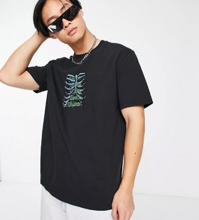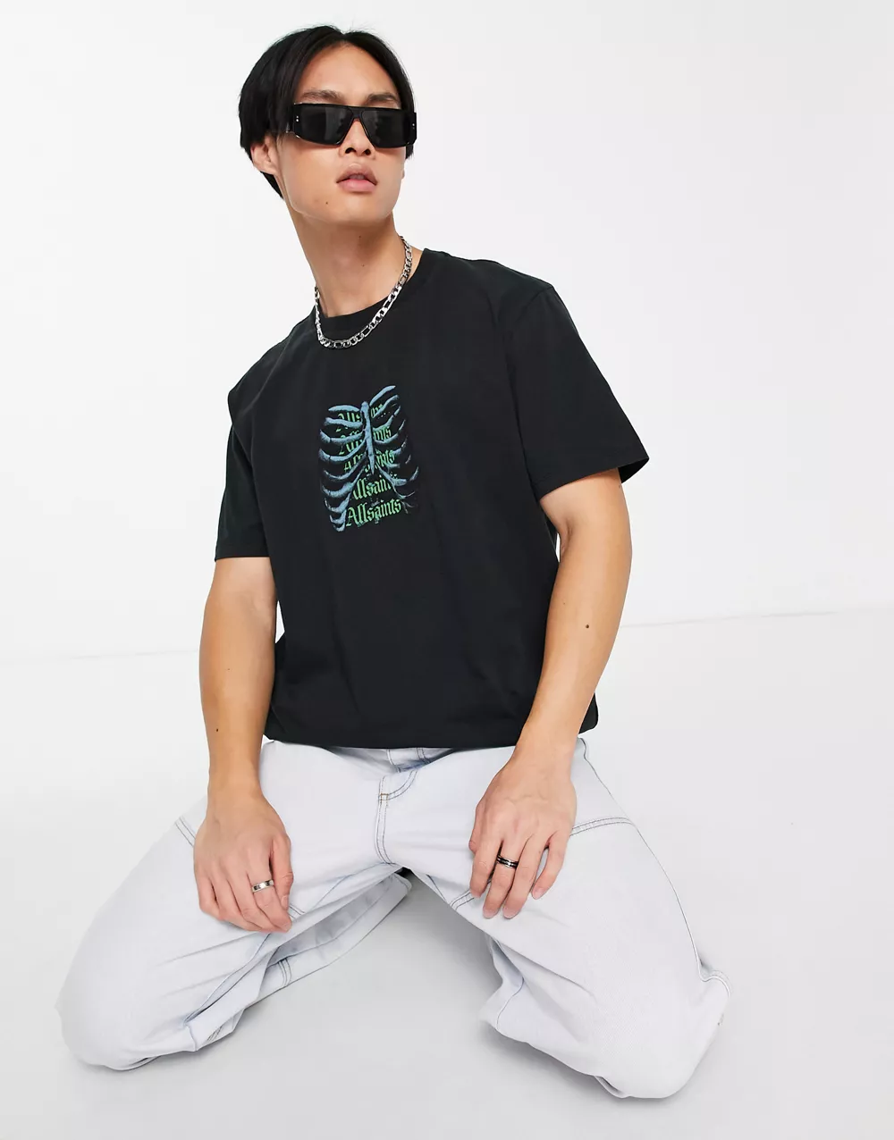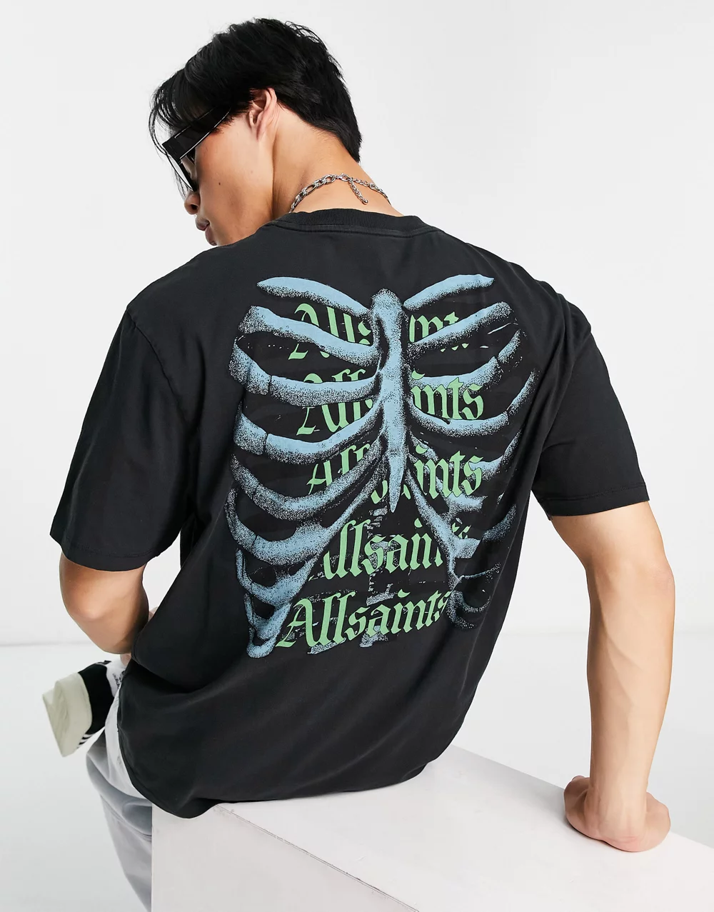 - AllSaints Caged t-shirt in washed black with back print Exclusive to ASOS