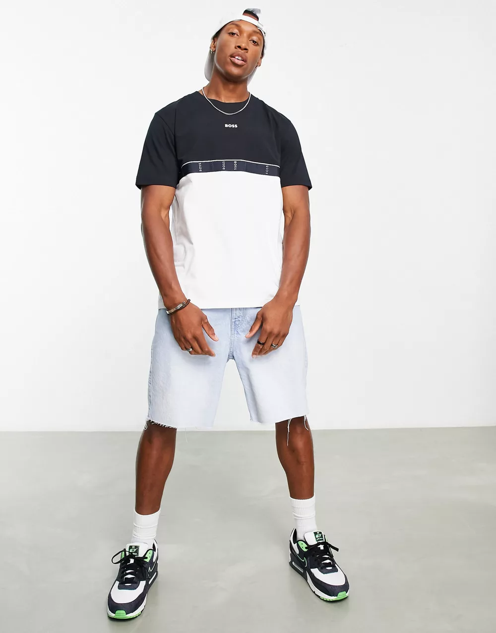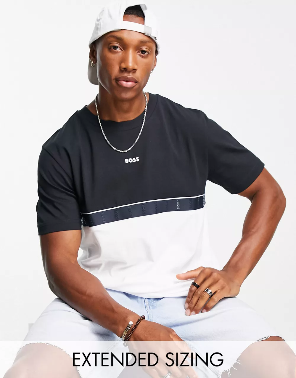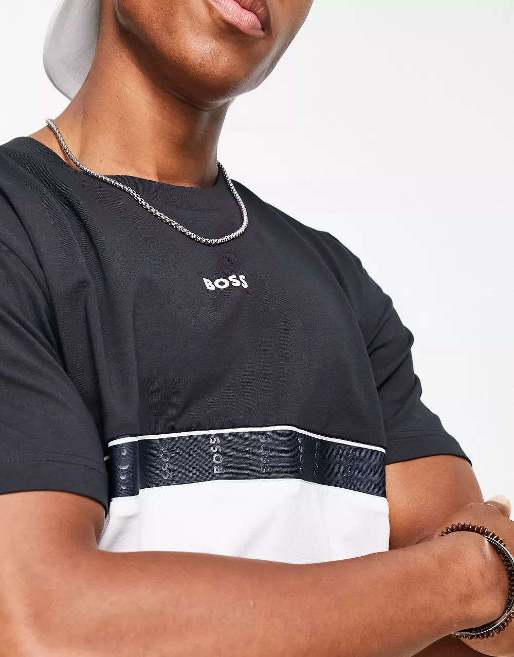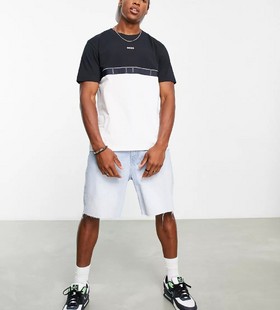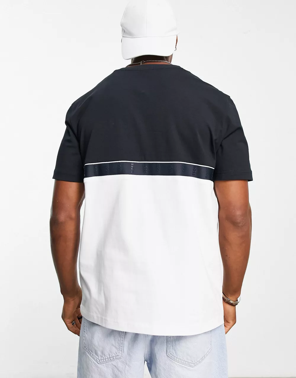 - BOSS Green Tee taped t-shirt in navy and white