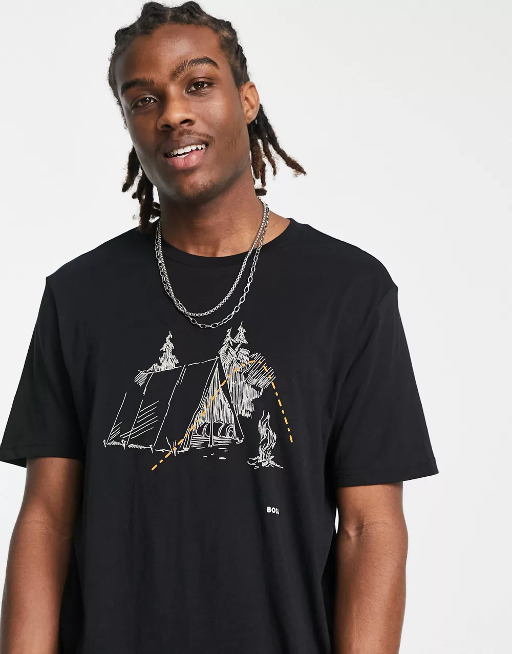 - BOSS Orange Teetuned 2 t-shirt in black with camping graphics