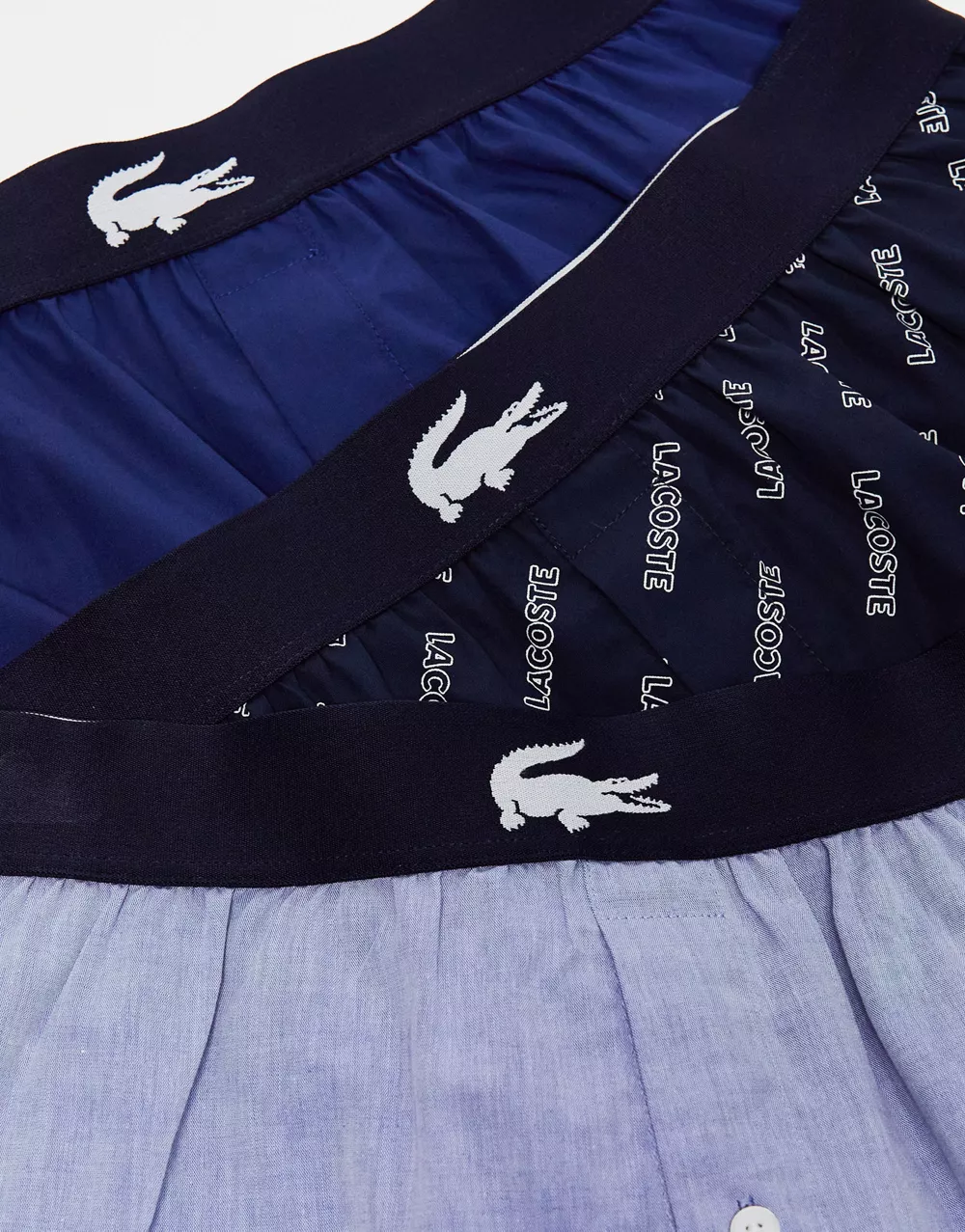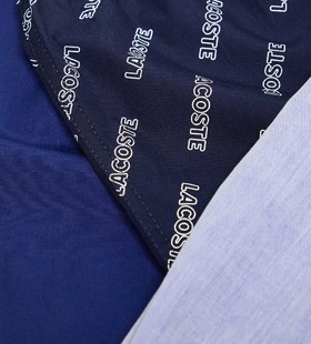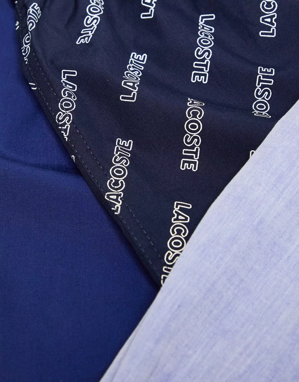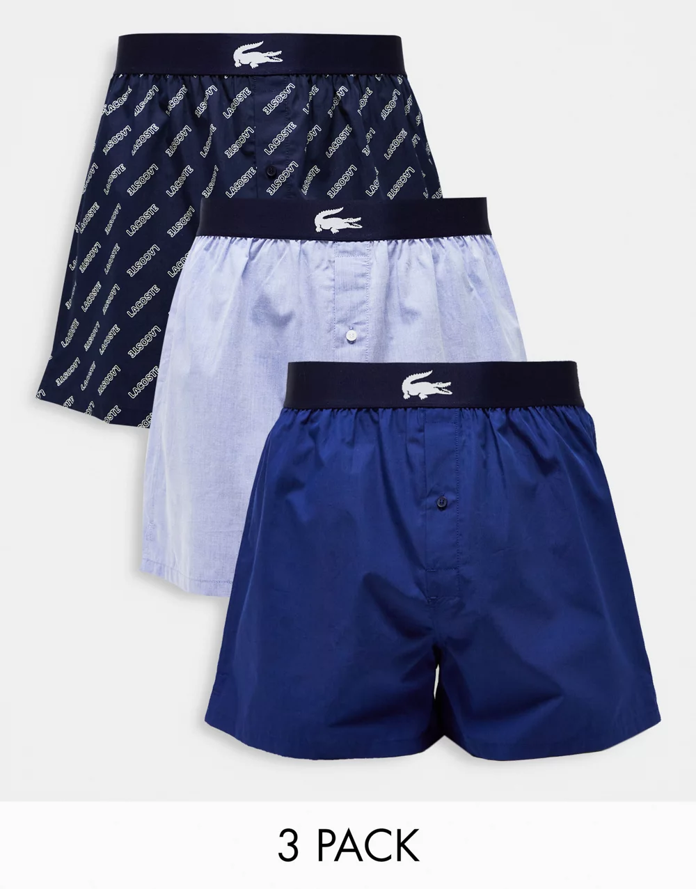 - Lacoste 3 pack woven boxers in blue tones with all over logo