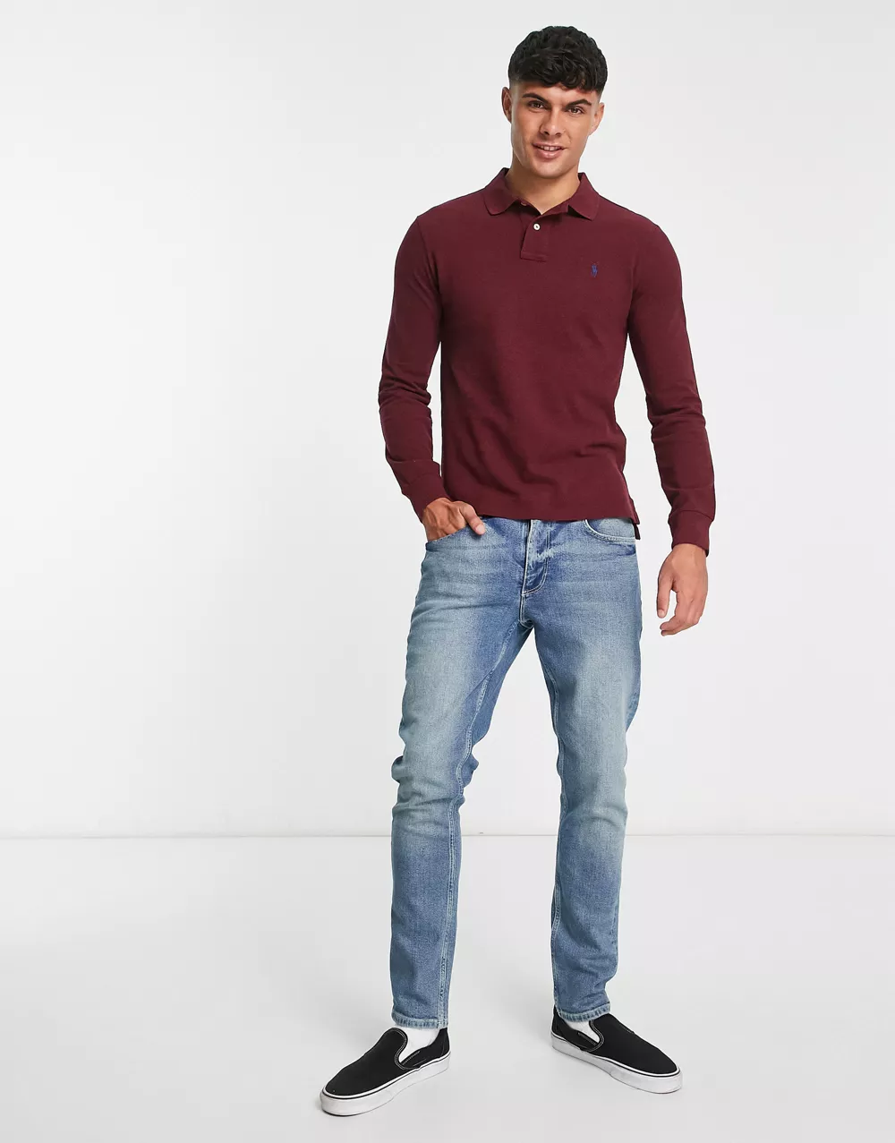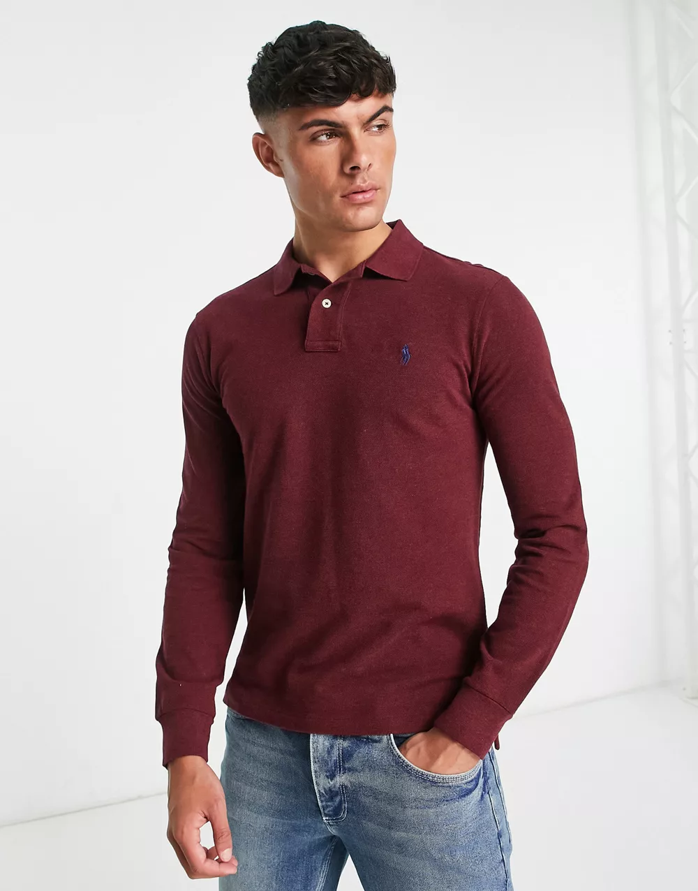 - Polo Ralph Lauren icon logo slim fit long sleeve pique polo in burgundy marl