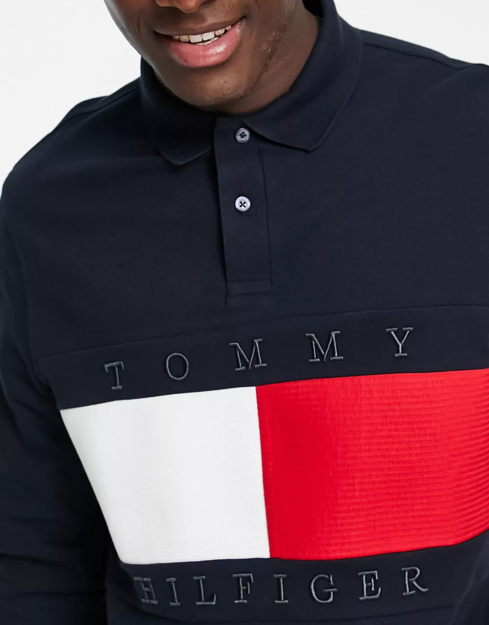 - Tommy Hilfiger large flag structure long sleeve cotton pique polo in navy