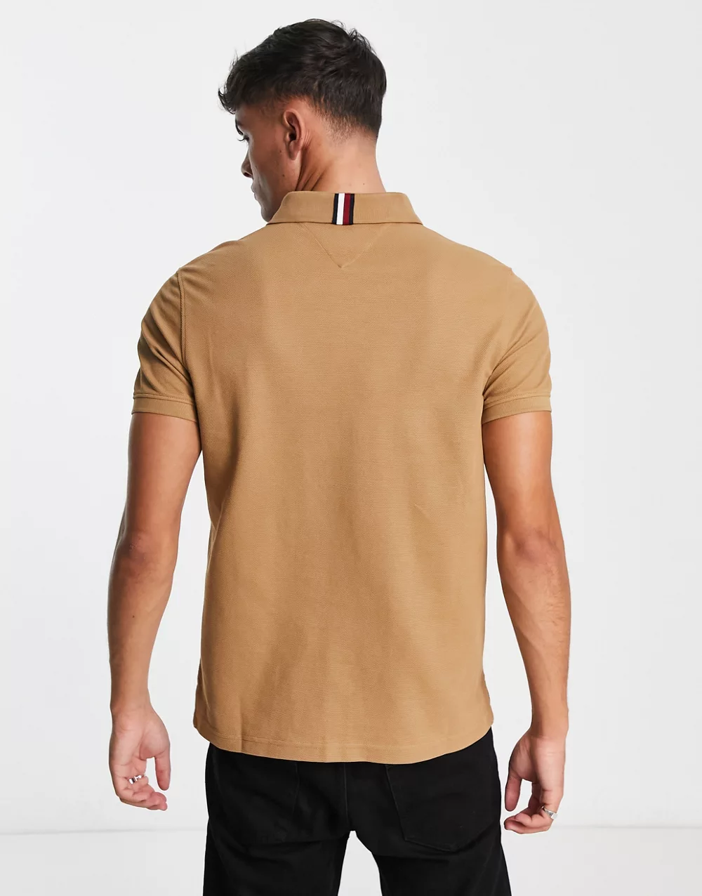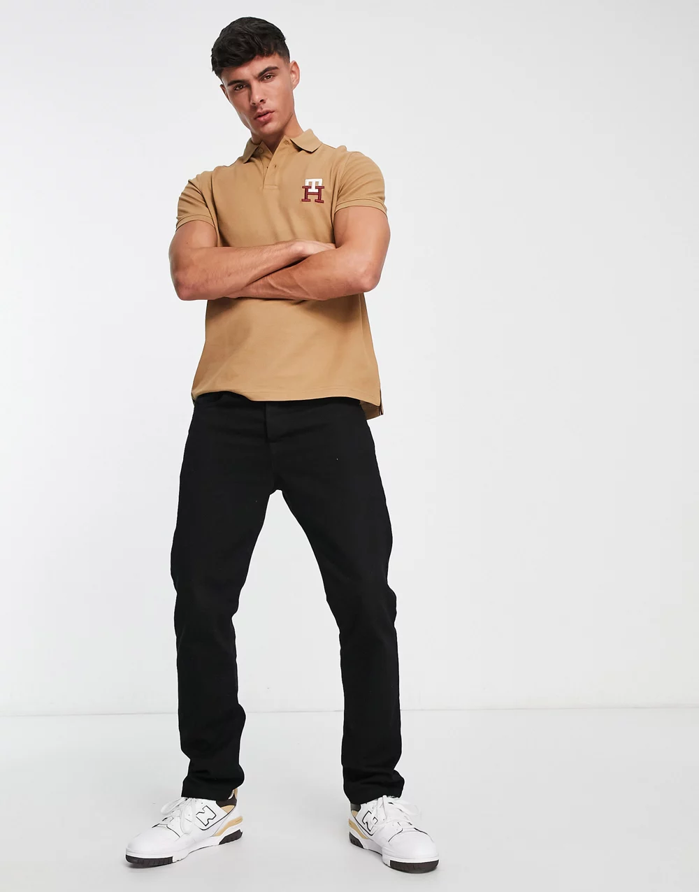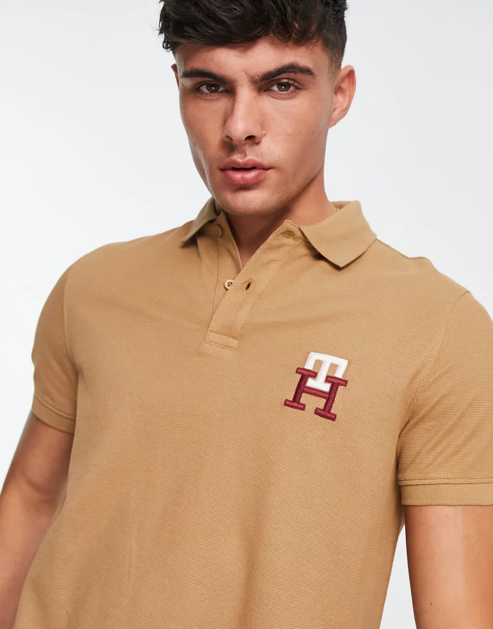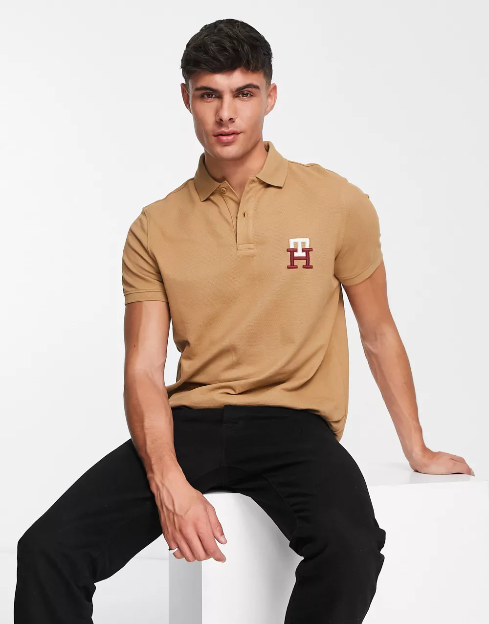 - Tommy Hilfiger monogram logo cotton blend pique polo in tan
