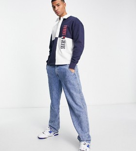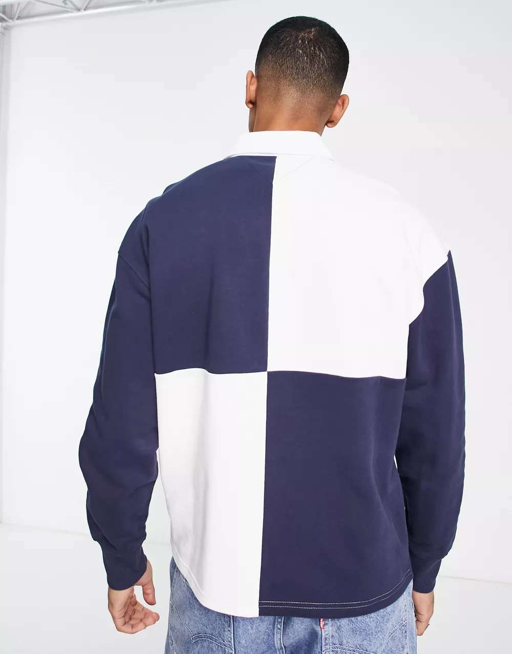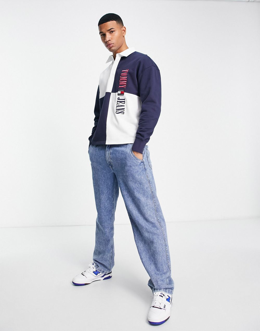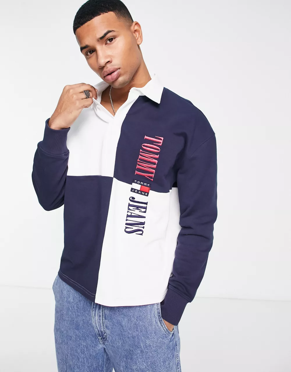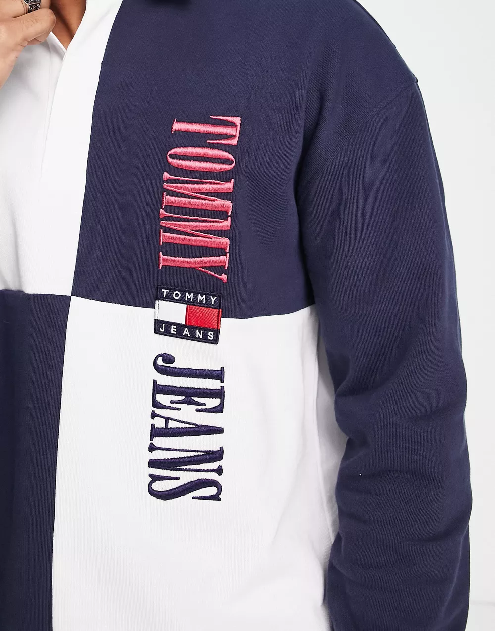 - Tommy Jeans archive logo colourblock relaxed fit rugby polo in navy
