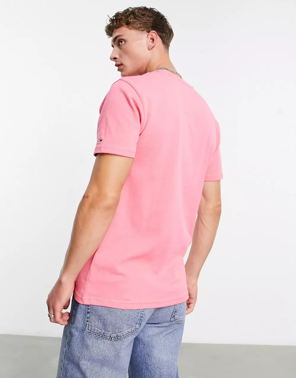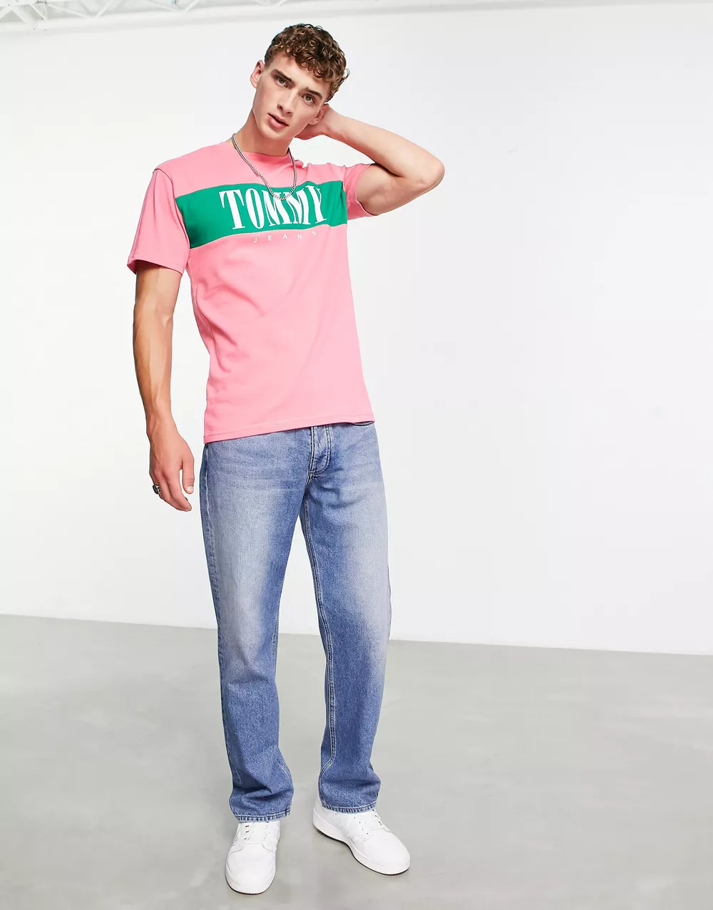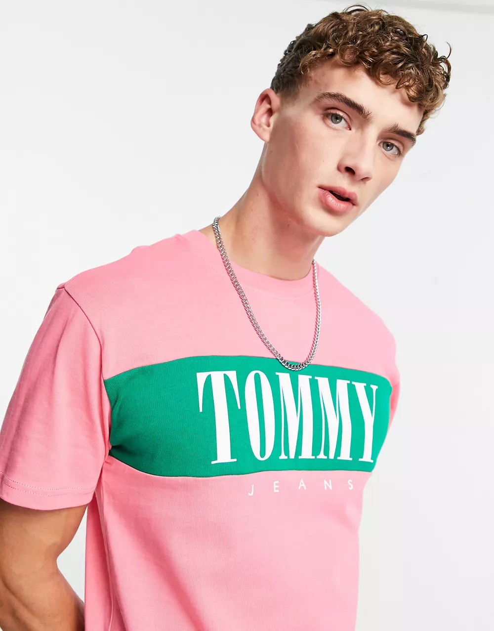 - Tommy Jeans classic fit colour block serif logo t-shirt in pink