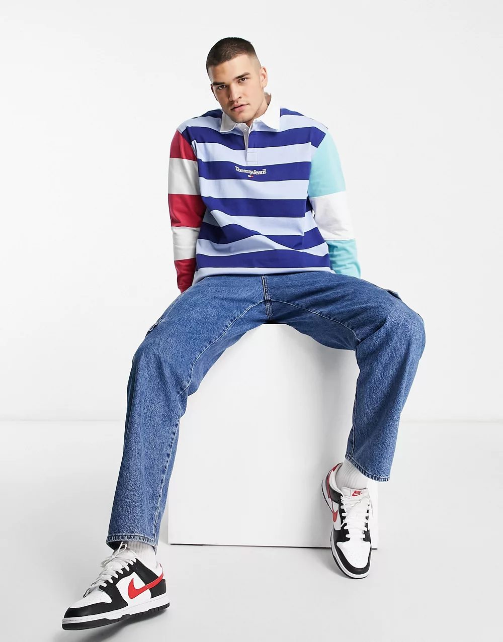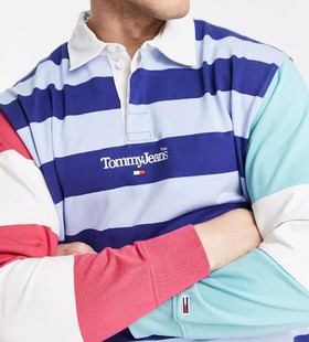 - Tommy Jeans novel stripe colourblock skater fit rugby polo in blue