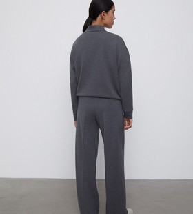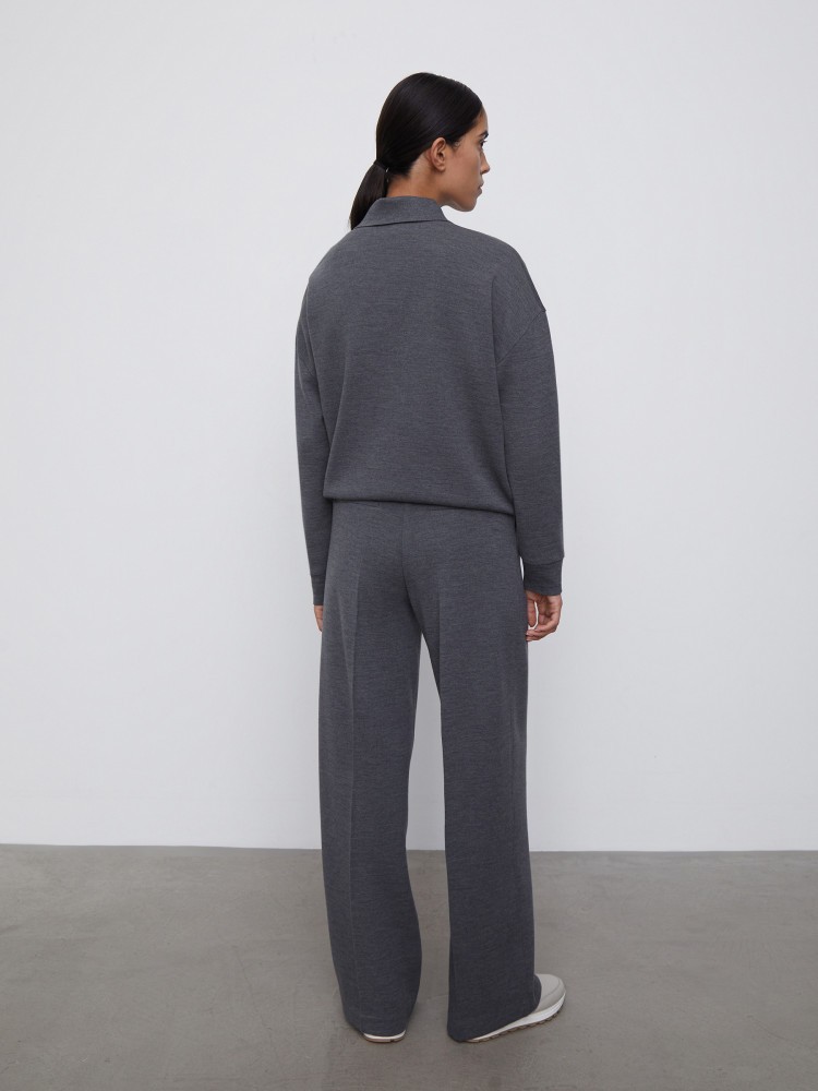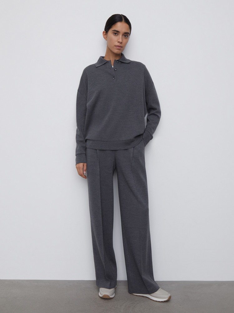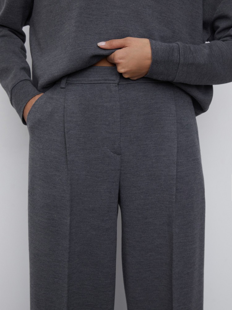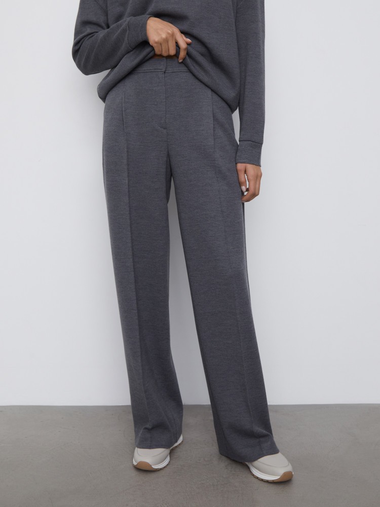 Прямые брюки напоминают костюмные: такие же складки от пояса, застежка на молнию, шлевки. Главное отличие — материал. Итальянский трикотаж на основе шерсти согревает и дает чувство свободы, а воздушный акрил придает ткани мягкость и пластичность.Сделано в Сербии.