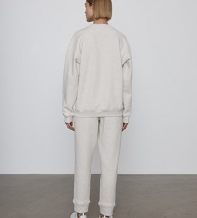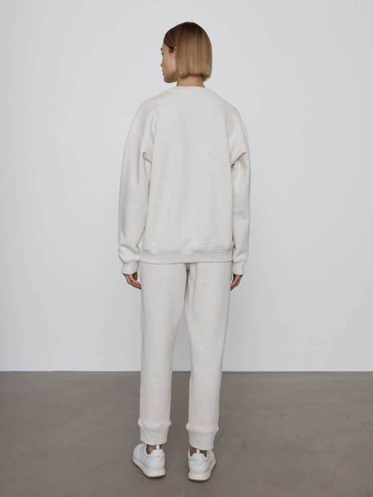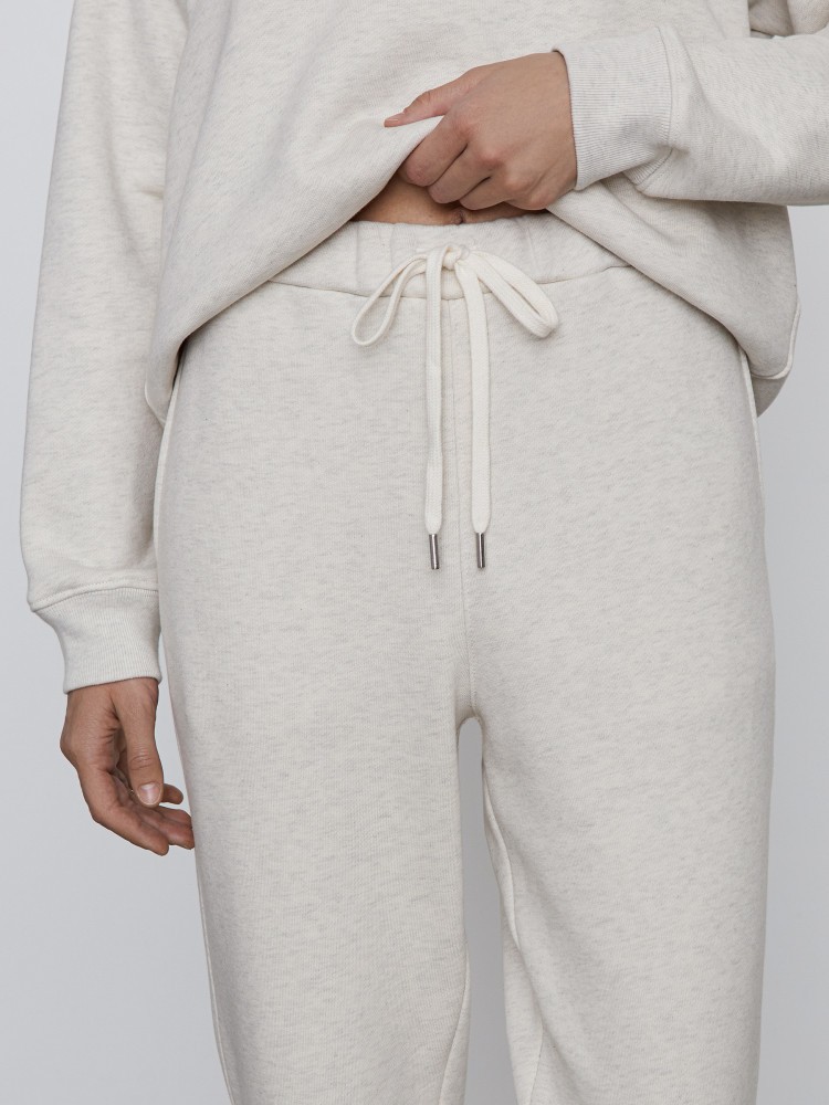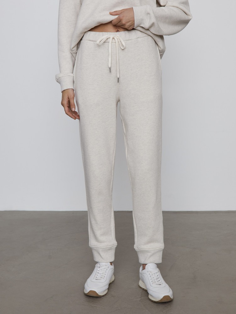 Брюки с комфортным поясом на резинке не создают лишний объем благодаря зауженному книзу силуэту. Модель сшита из плотного трикотажа экстра-пенье без начеса, для которого отобрали самые длинные и прочные волокна австралийского хлопка. Материал отлично регулирует температуру тела, мало мнется и долго служит.Сделано в России.