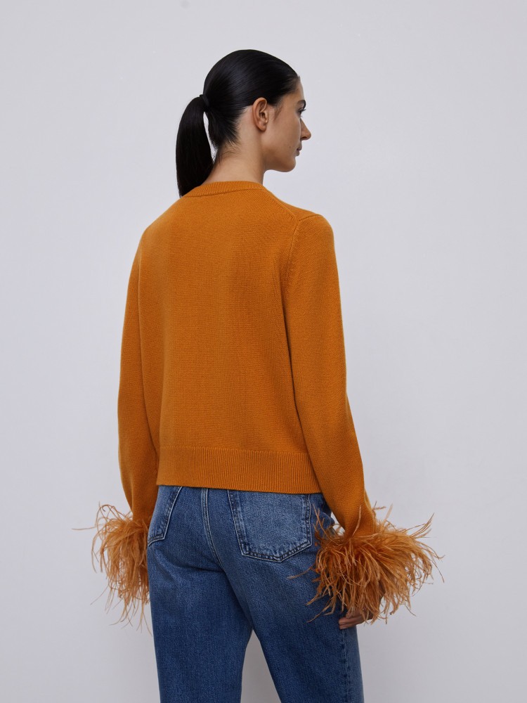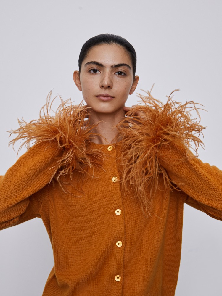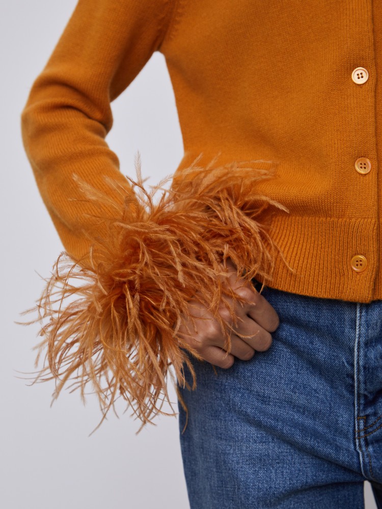 Кардиган с перьями легко превратит casual-образ с джинсами в вечерний. Модель связана из мягкой и дышащей шерсти мериноса и украшена пуговицами из натурального перламутра. Пушистые манжеты из страусиных перьев можно в любой момент снять — это удобно, если до вечеринки у вас еще много дел.Сделано в Китае.