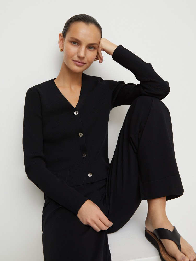 Укороченный кардиган комфортно облегает силуэт благодаря плотному переплетению в рубчик. Связан из мягкой упругой пряжи, в которой шелковистые волокна вискозы переплетаются с гладкой искусственной нитью — несмотря на плотность трикотаж остается тонким и дышащим. Рекомендуем подбирать белье в тон. Можно составить комплект с топом и брюками из коллекции 12 STOREEZ.Сделано в Китае.