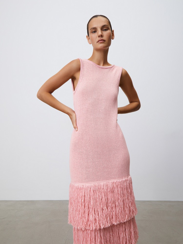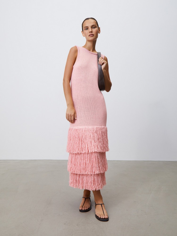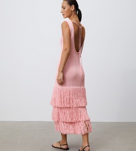 Вечернее платье с глубоким вырезом на спине и ярусной бахромой из тонких нитей — образ, который выделит вас среди других. Тяжелый плотный трикотаж комфортно облегает силуэт, а дышащие волокна льна и хлопка сохраняют оптимальную температуру кожи.Платье может вытягиваться под собственным весом. Пожалуйста, храните его на полке.Сделано в Китае.
