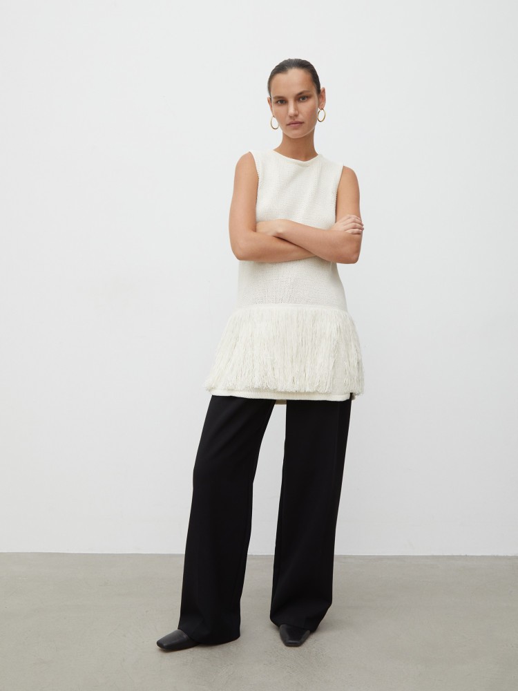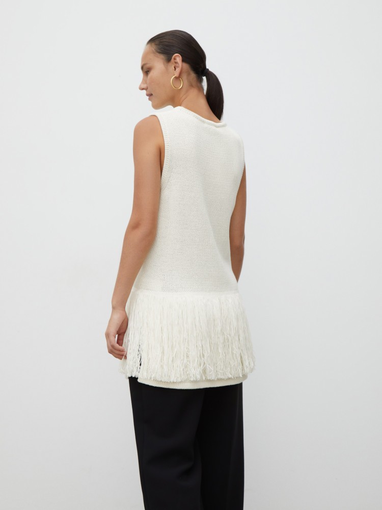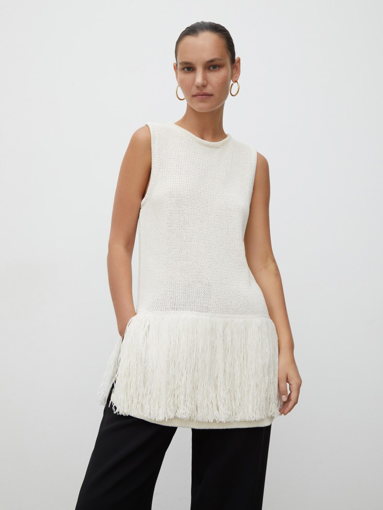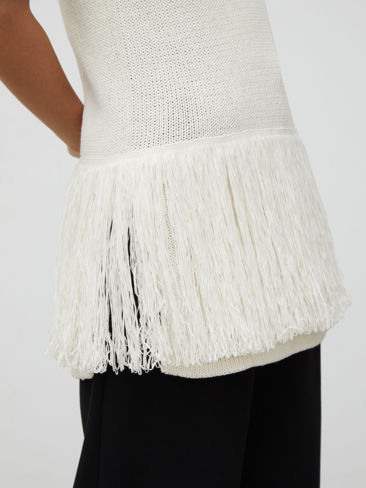 Вечерний том с необычным декором — летящей бахромой из тонких длинных нитей. Тяжелый плотный трикотаж комфортно облегает силуэт, а дышащие волокна льна и хлопка сохраняют оптимальную температуру кожи. Топ может вытягиваться под собственным весом. Пожалуйста, храните его на полке.Сделано в Китае.