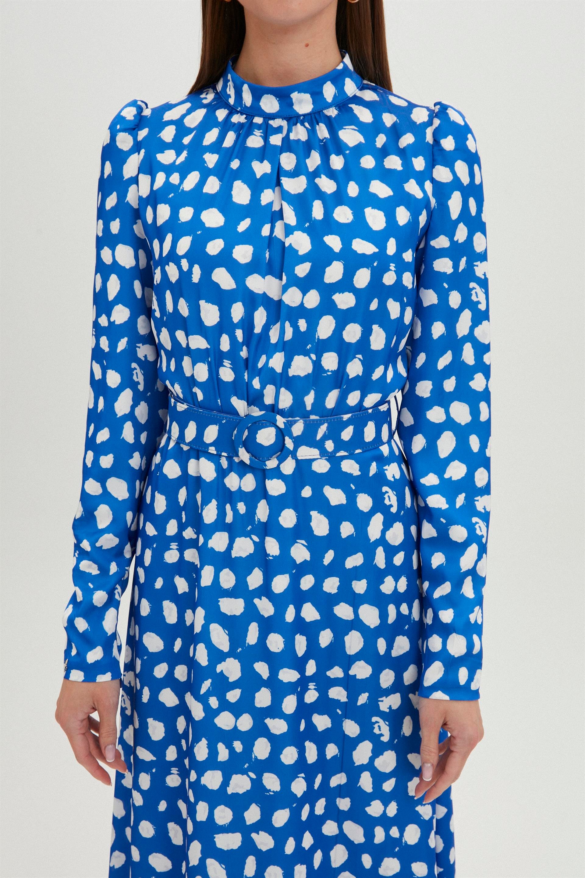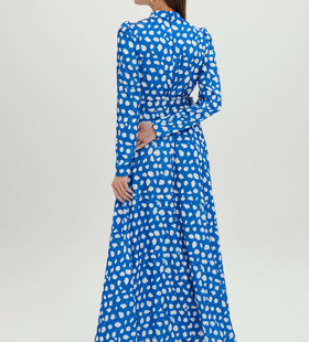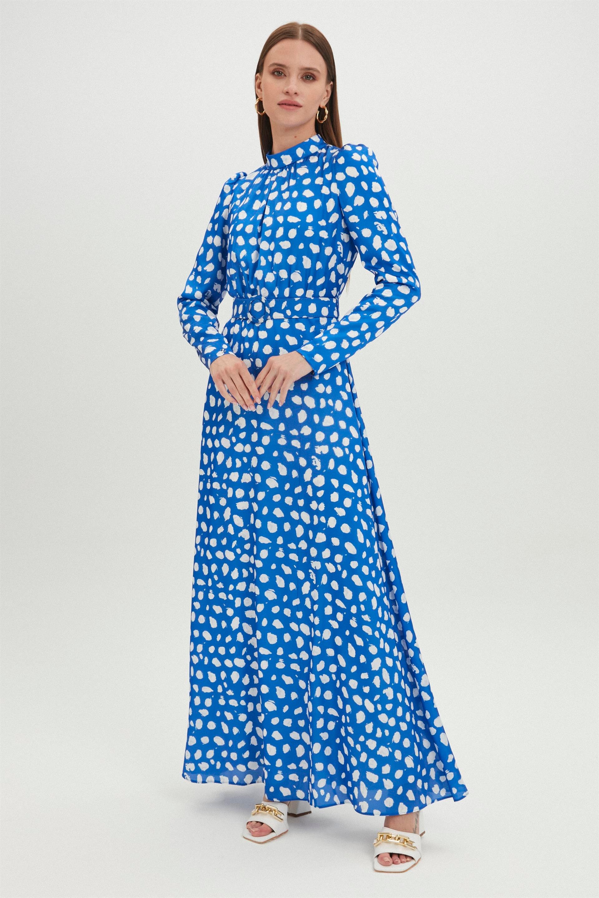 - Длинное синее платье с высоким воротником