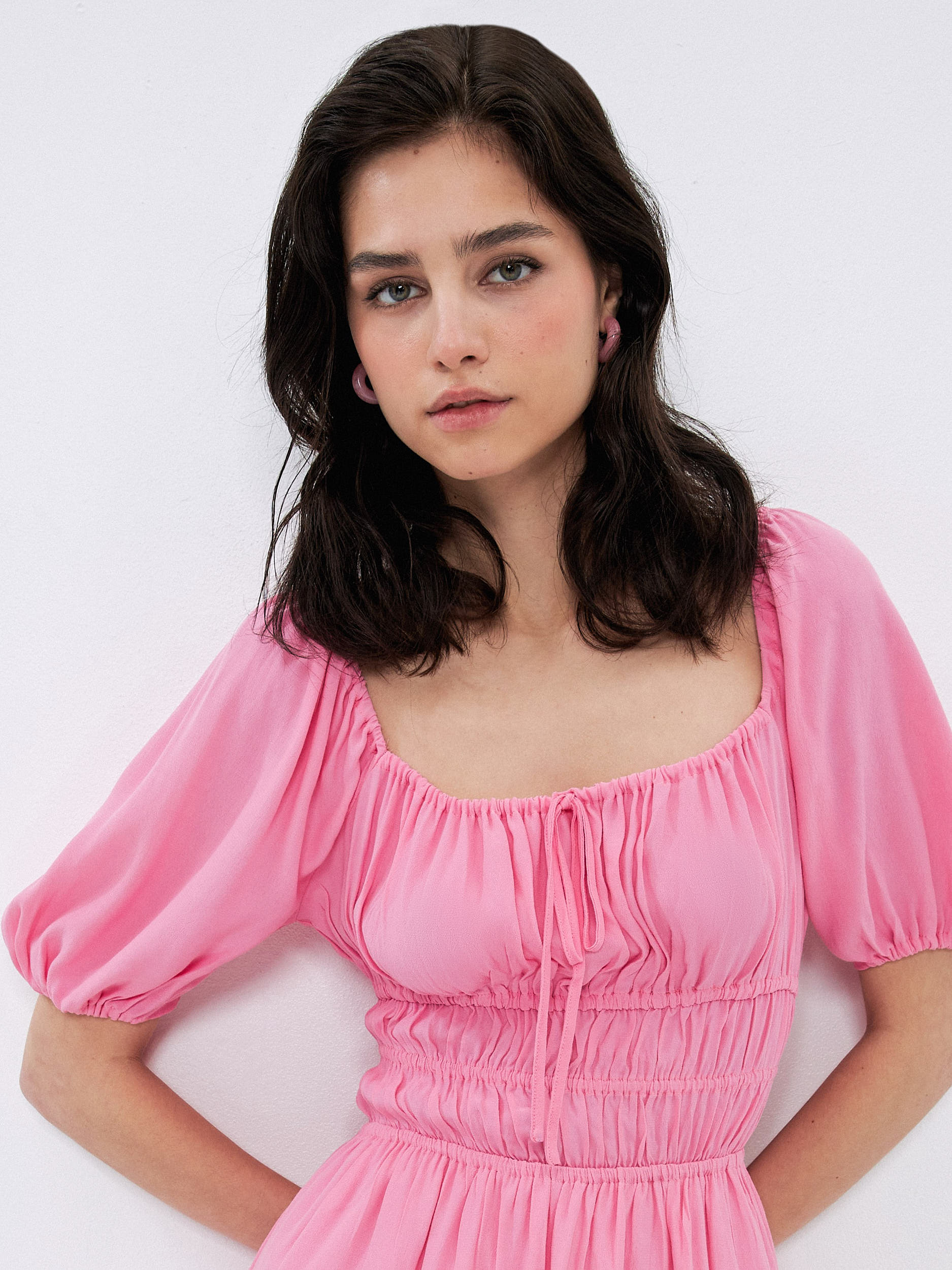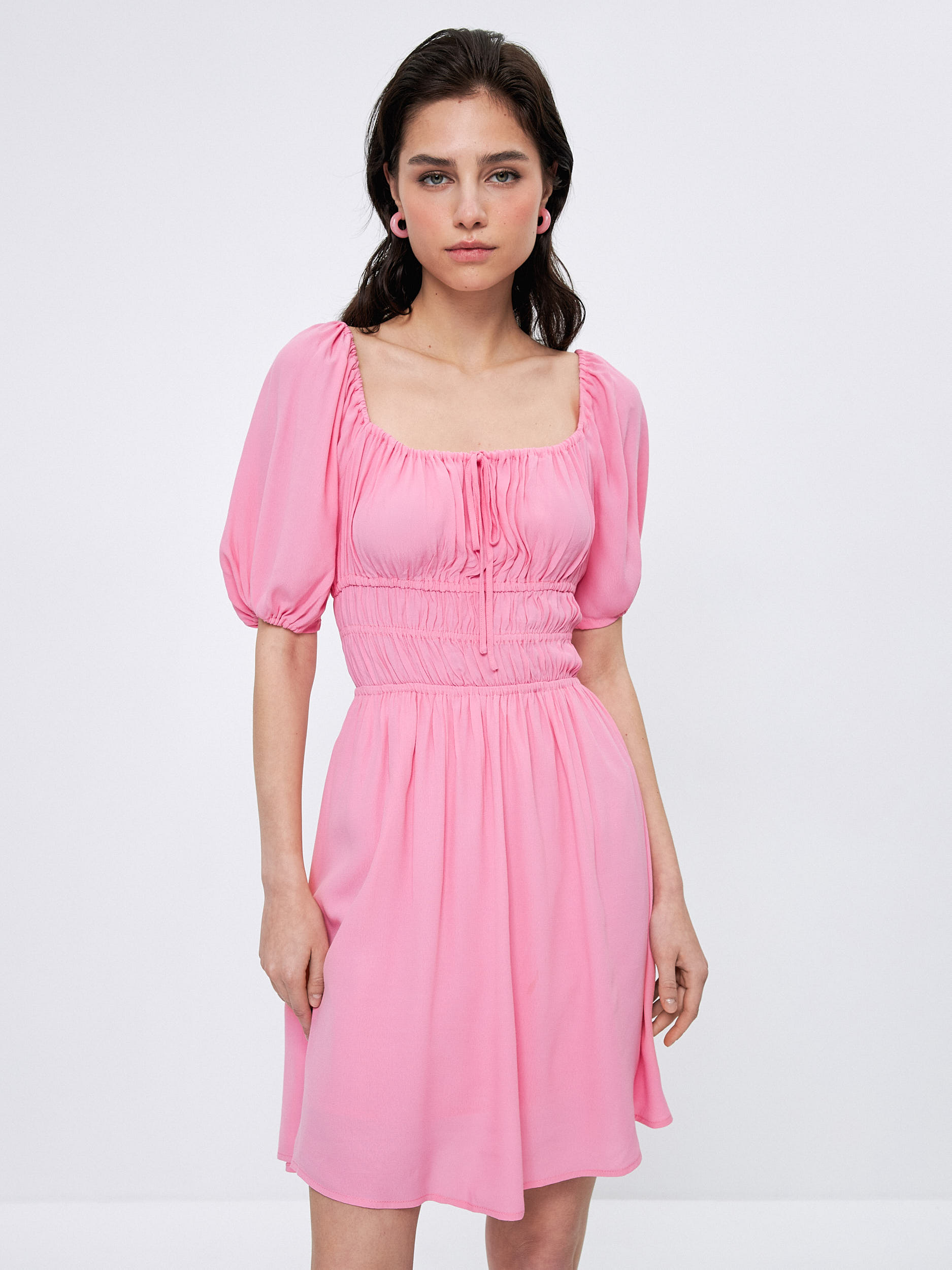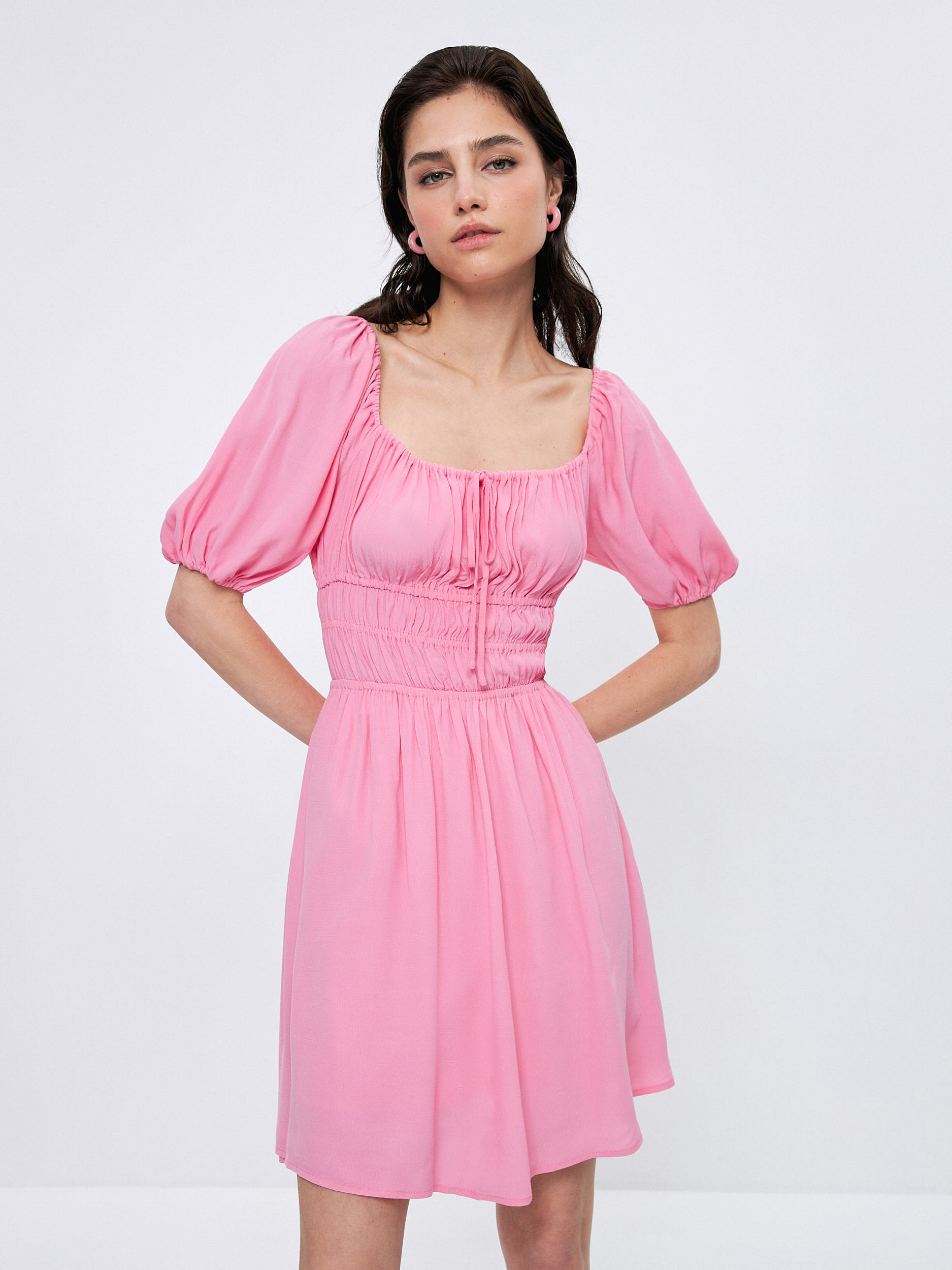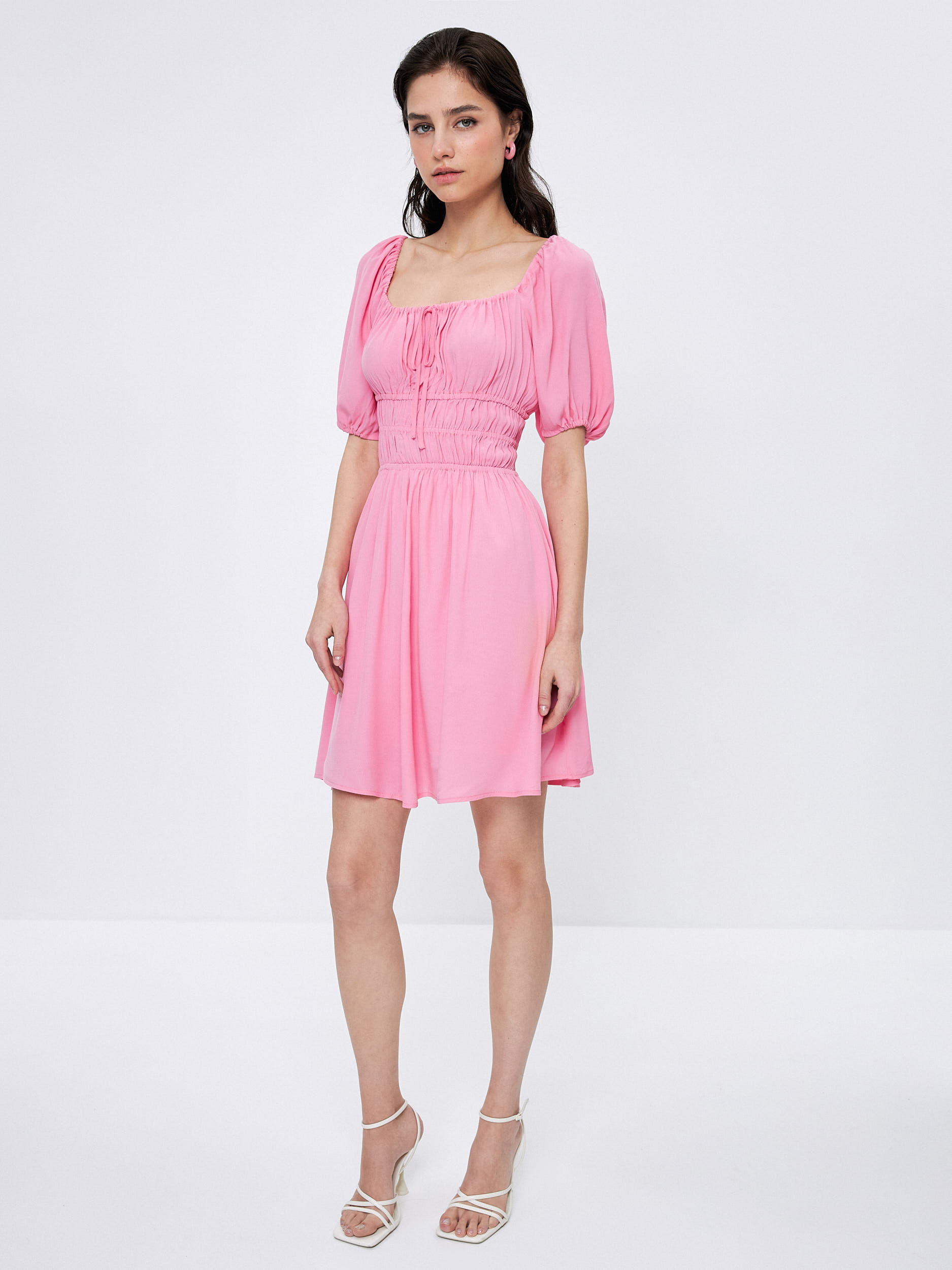 Параметры: Декор: завязки; Застежка: без застежки; Силуэт: приталенный; Тип карманов: без карманов; Тип рукава: 3/4; Стиль: Вечерний; Повседневный; Длина платья/юбки: мини; Вырез горловины: каре
