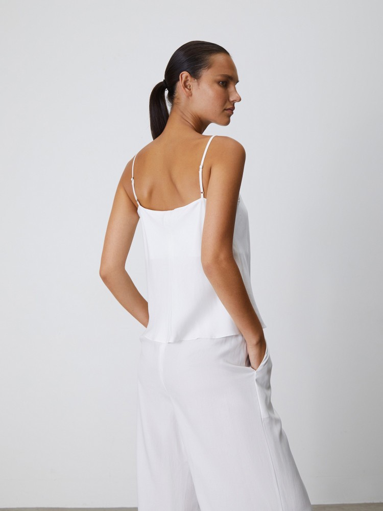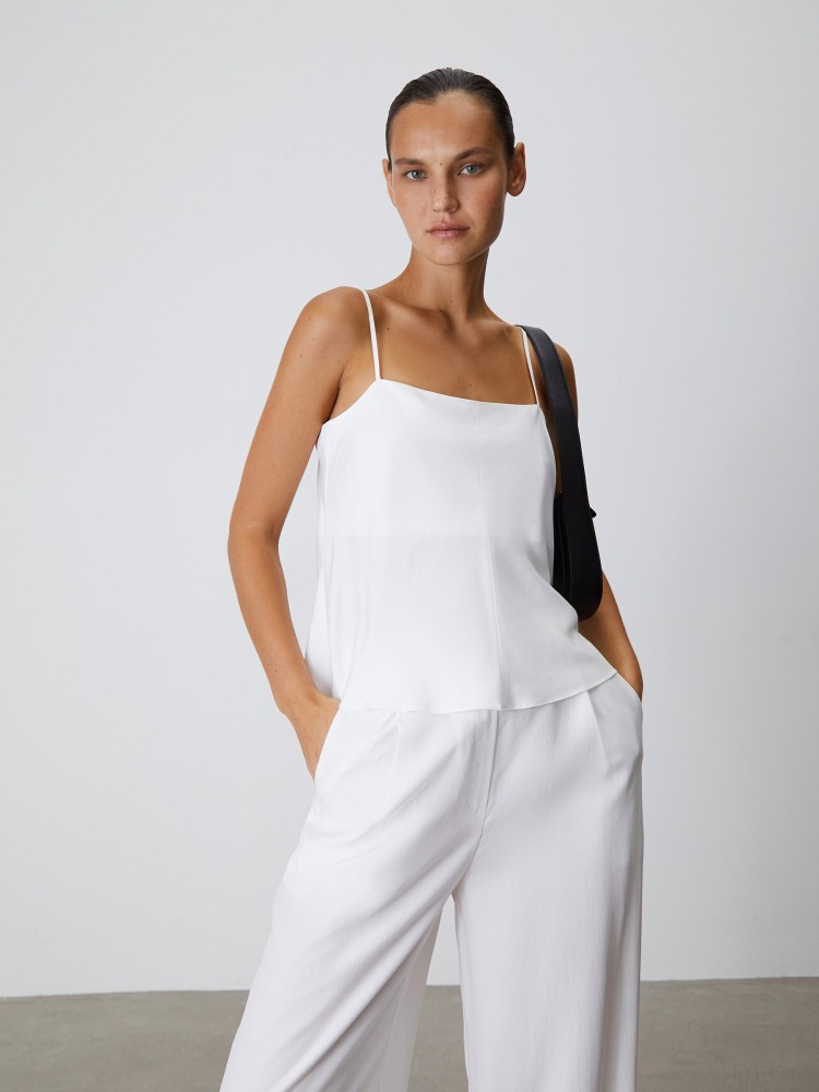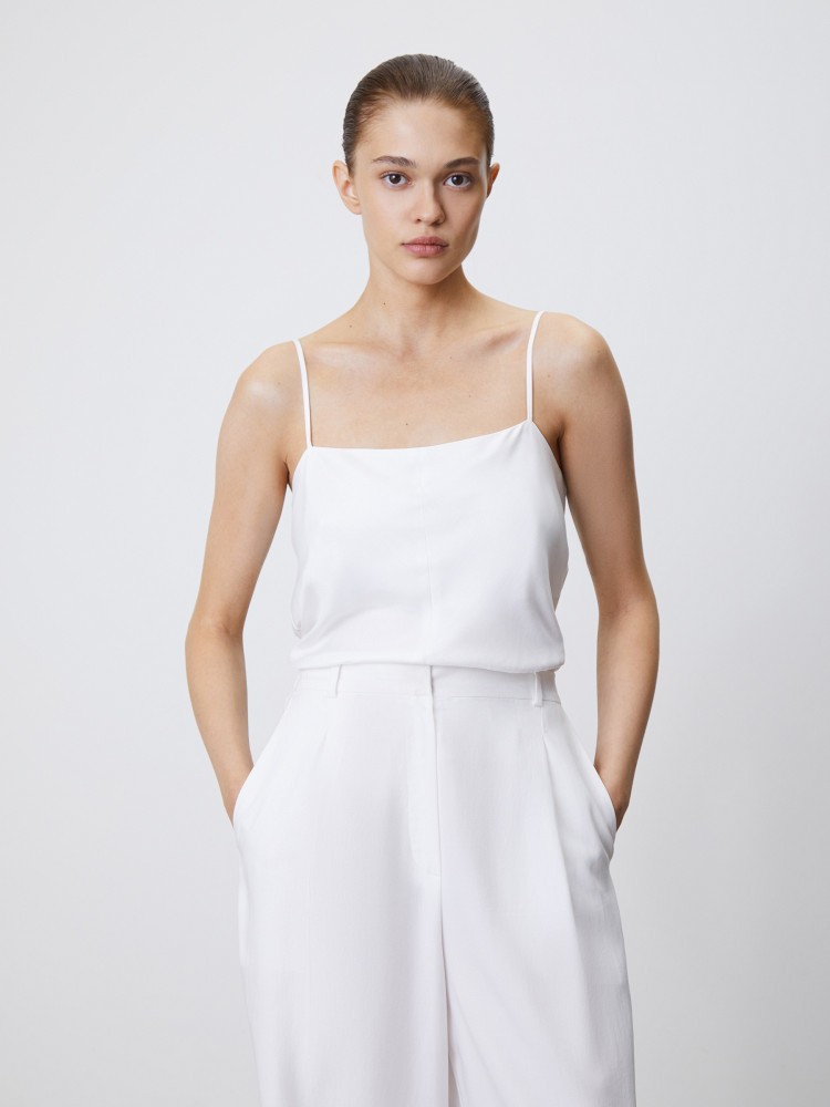 Прямой топ на тонких бретелях поможет собраться на вечеринку за несколько минут. Добавьте светлые джинсы, жакет или кашемировый джемпер, белые кеды, соберите волосы — все, можно выходить. Мягкая и нежная к коже ткань отлично дышит благодаря вискозе, а струящийся шелк добавляет ей едва неброское сияние.