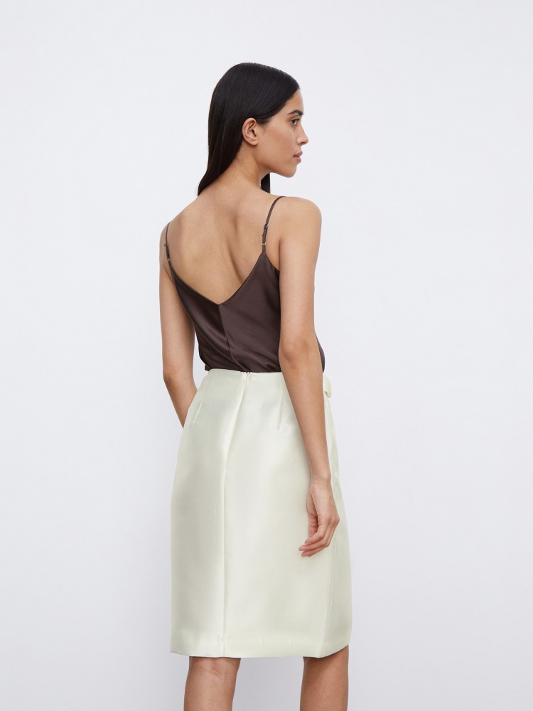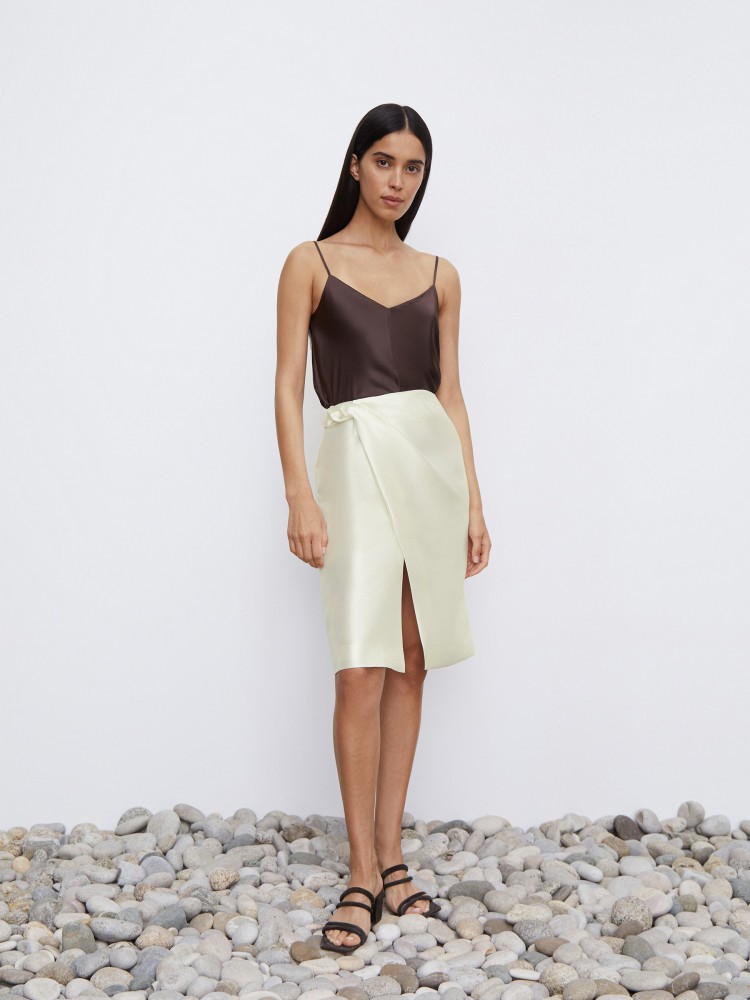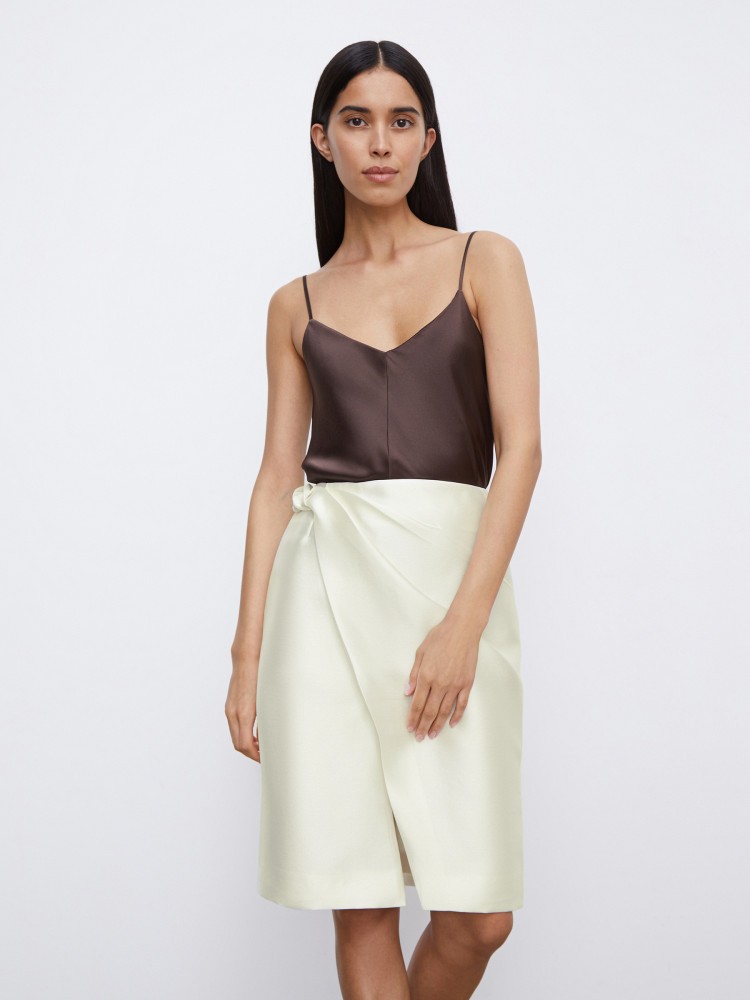 Юбка из блестящей тафты. Сложный крой этой юбки подчеркивает фактуру переливающейся ткани, а смещенный от центра разрез приоткрывается, когда вы сидите нога на ногу. Для модели выбраны тонкая и плотная тафта, которая отлично удерживает форму, и шелковистая подкладка, которая отвечает за ваш комфорт.