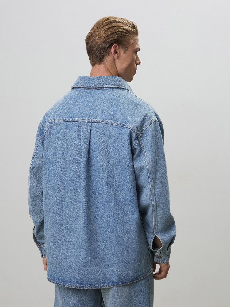 Свободная, но не слишком, рубашка классического синего цвета отлично впишется в образы с футболками и толстовками. Для модели выбрали прочный деним плотностью 13,5 Oz с выраженными эффектами варки по швам.