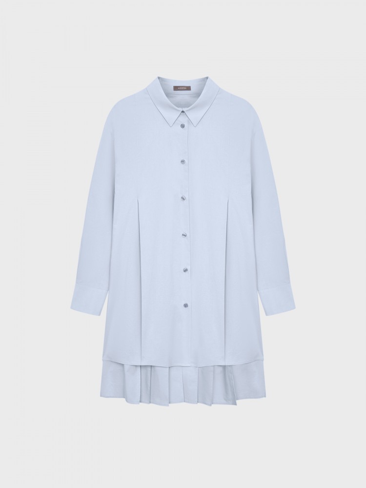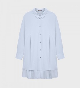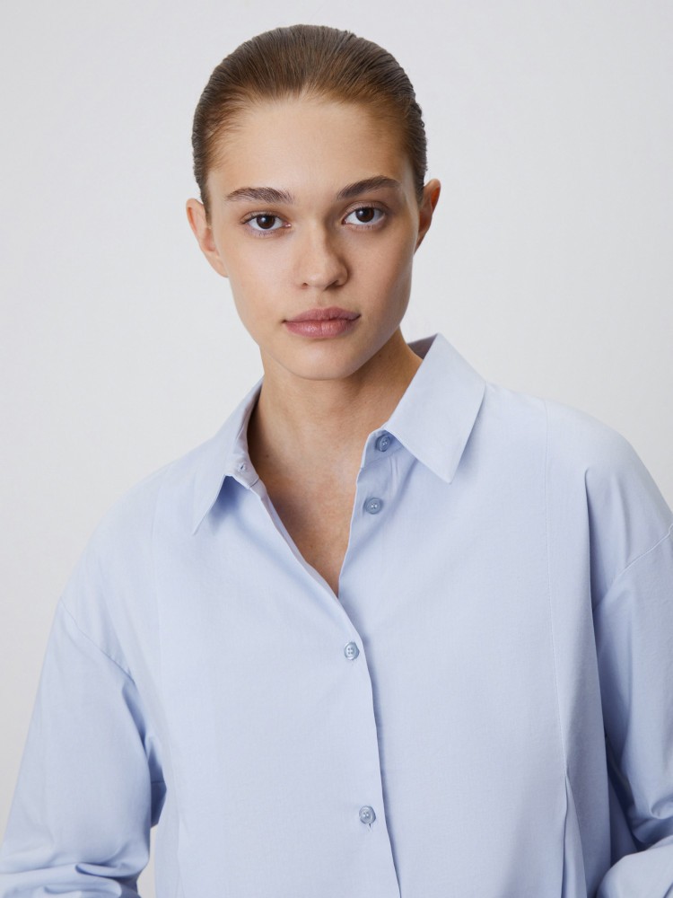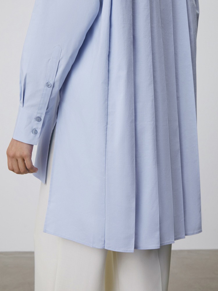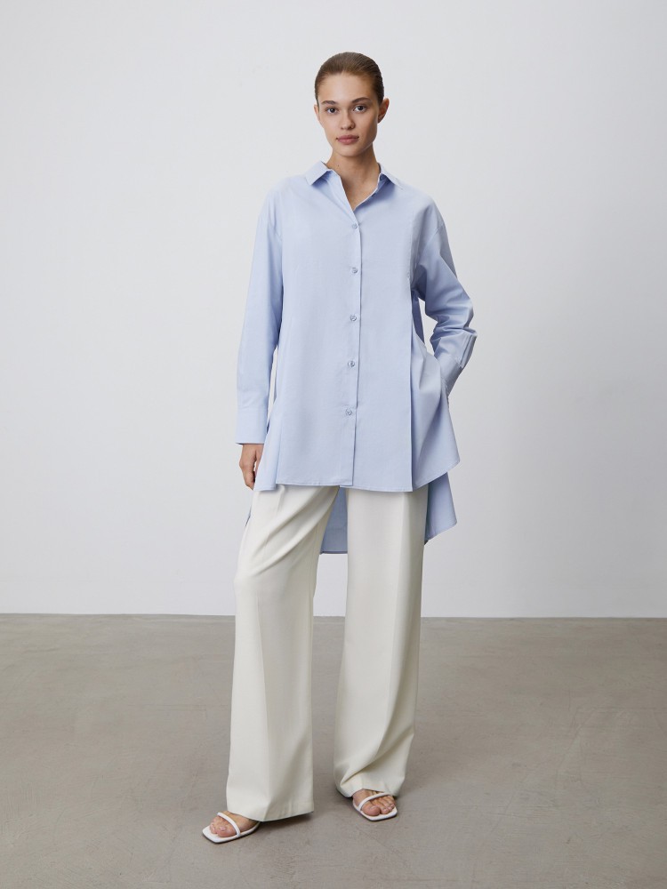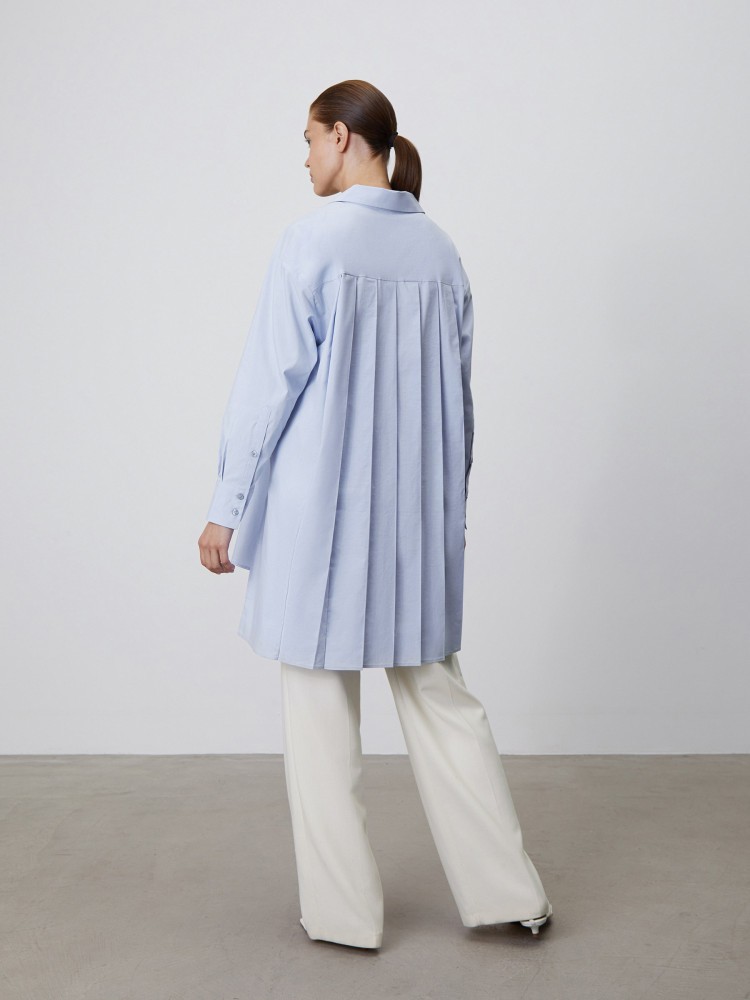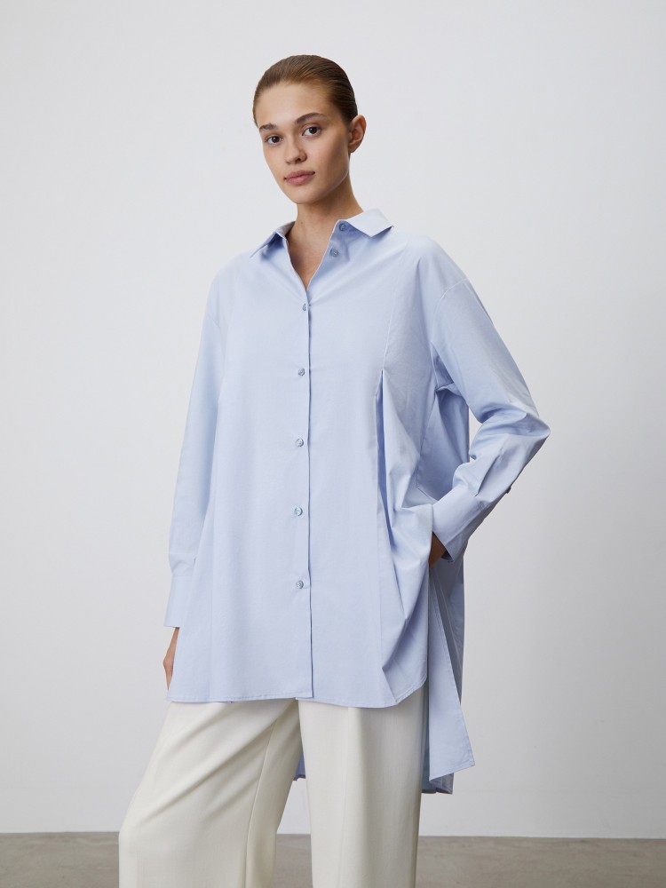 Удлиненную свободную рубашку дополнили плиссированной деталью и защипами, а чтобы вам было удобнее двигаться, по бокам предусмотрены небольшие разрезы. Ткань на основе хлопка хорошо дышит и держит складки за счет добавления искусственных волокон. Можно носить как рубашку и платье мини с сандалиями.Сделано в Турции.