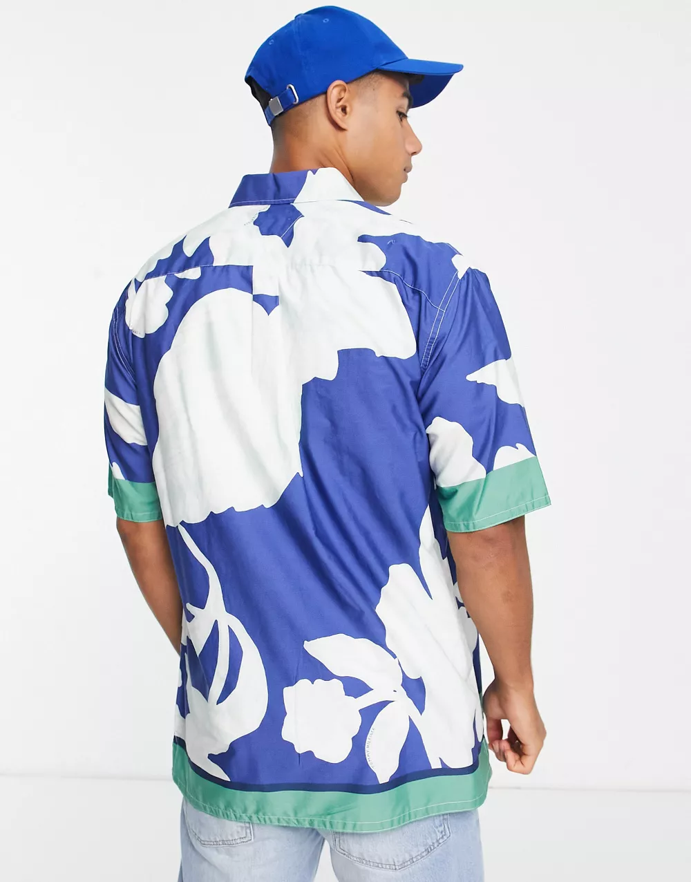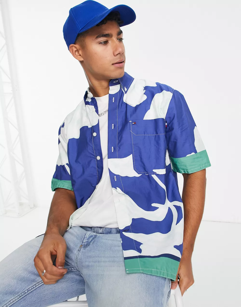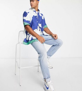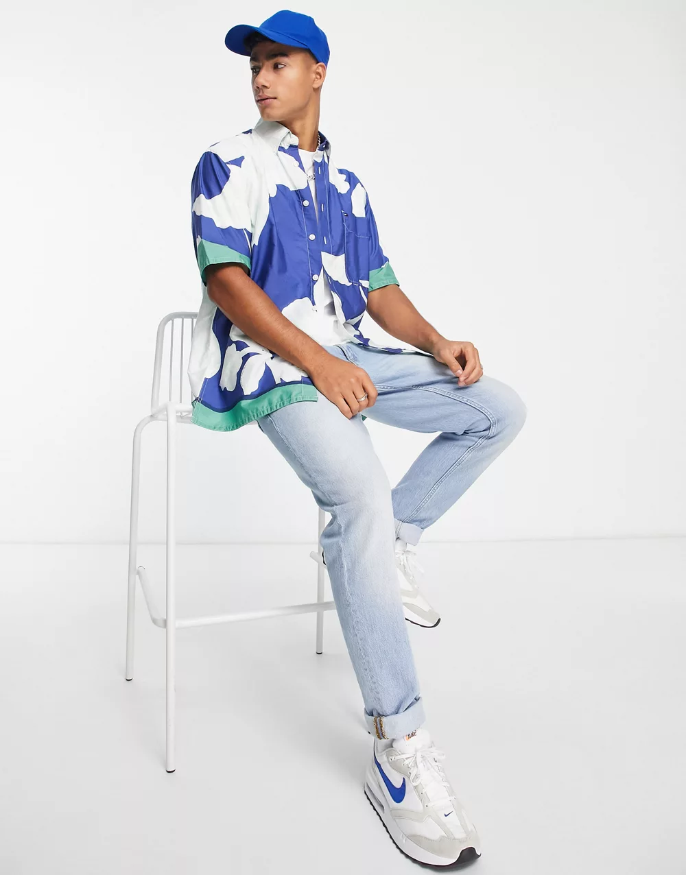 HUGO 634 tapered fit jeans in bright blue with all over print