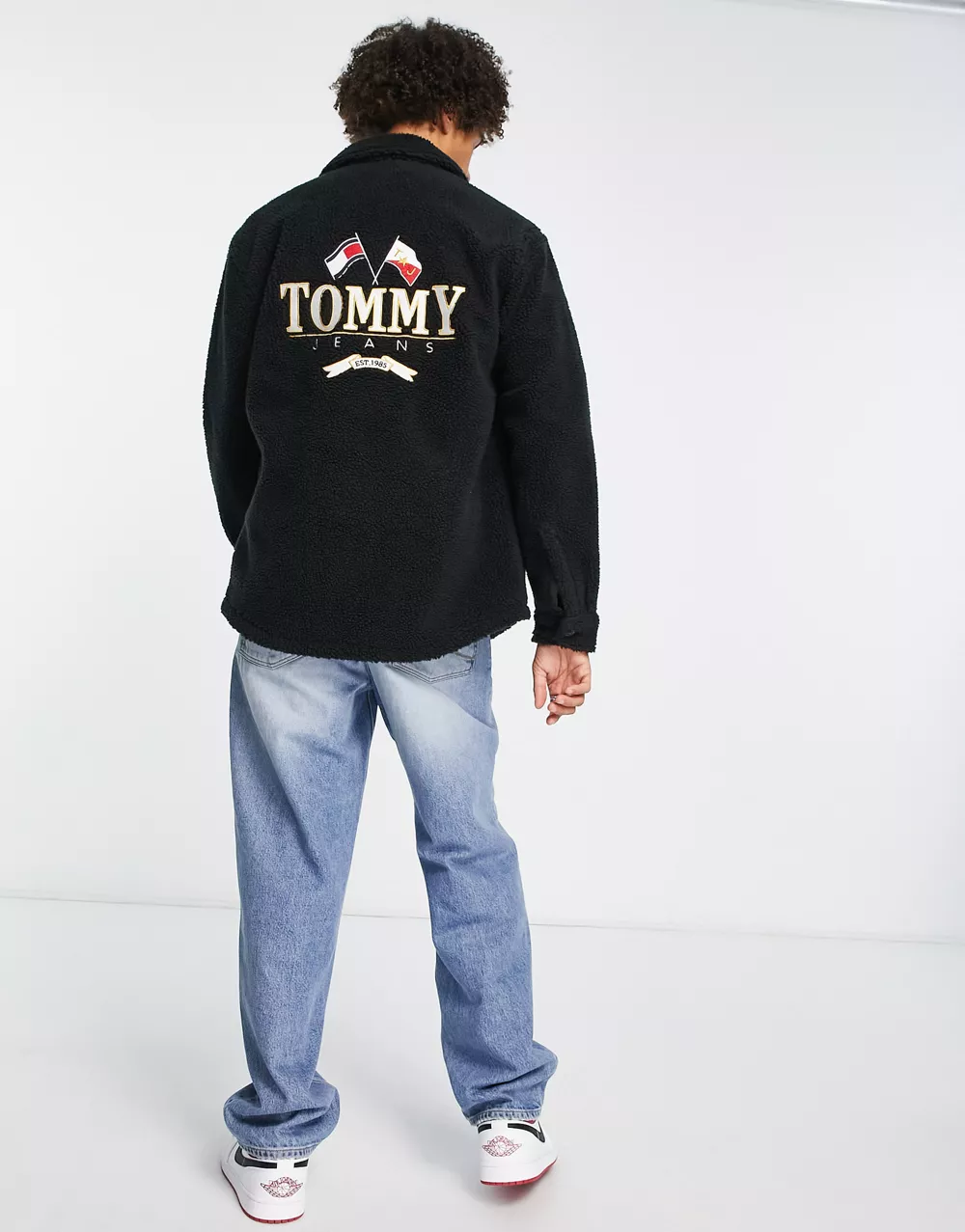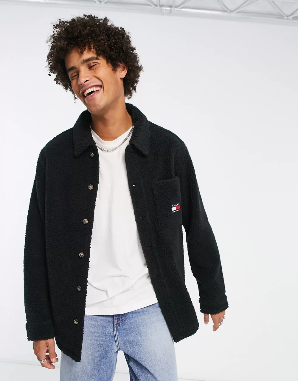 Tommy Jeans flag logo sherpa lined overshirt in dark green
