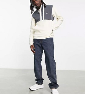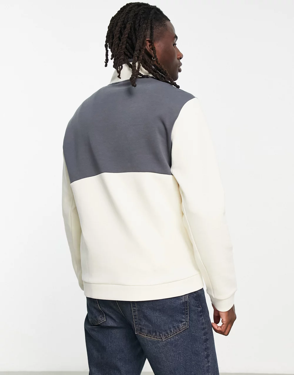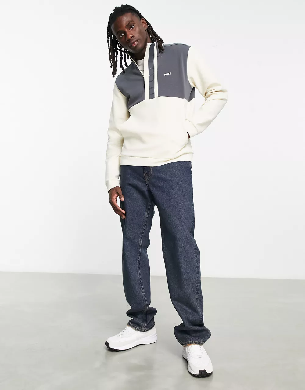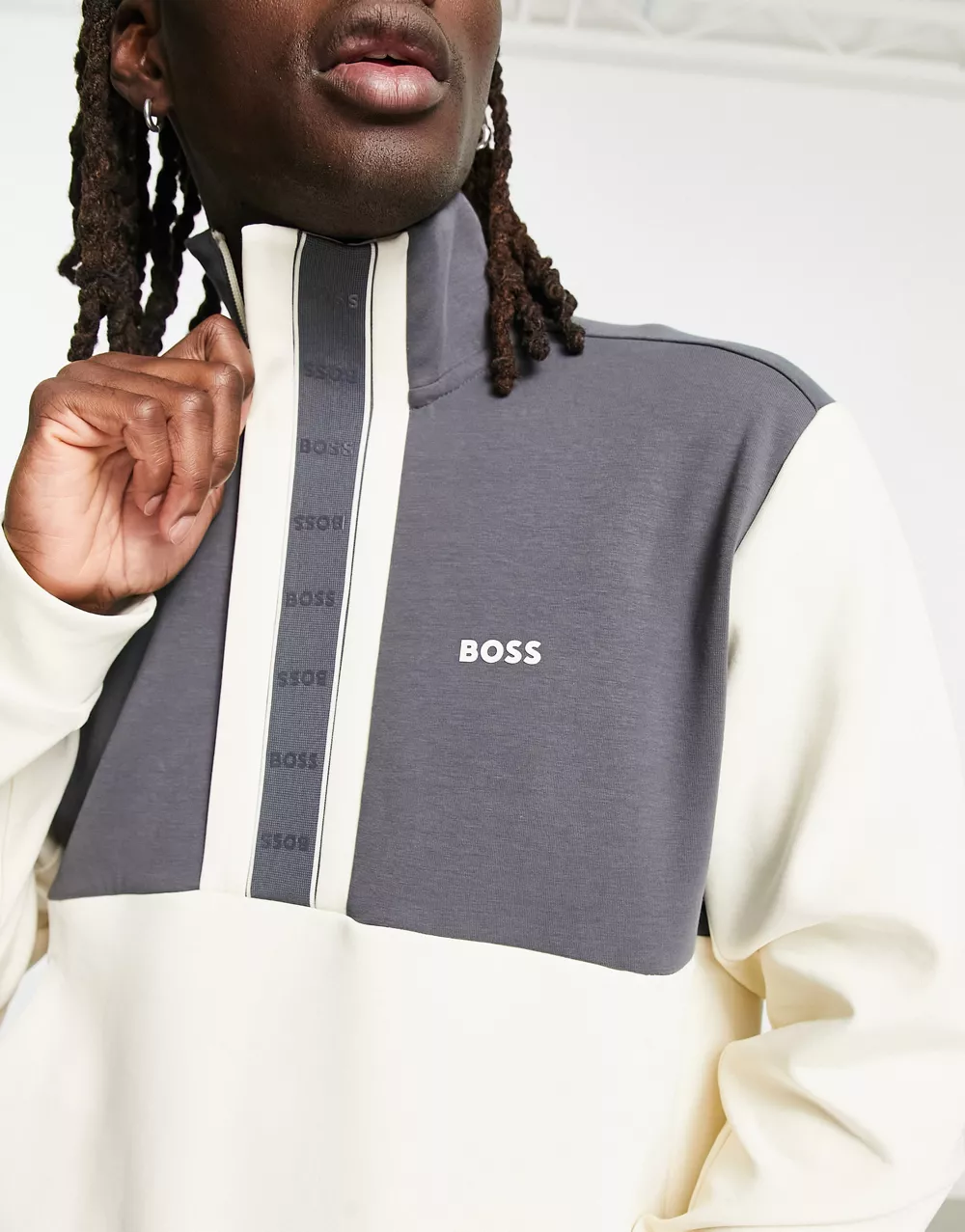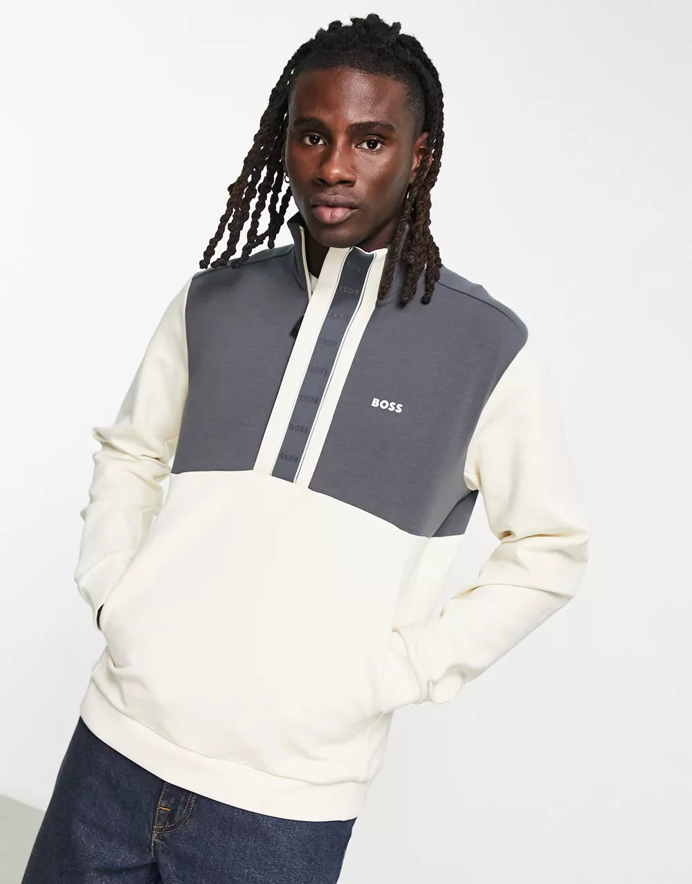 - BOSS Green Sweat 1 tapped 1/4 zip sweatshirt in off white and navy