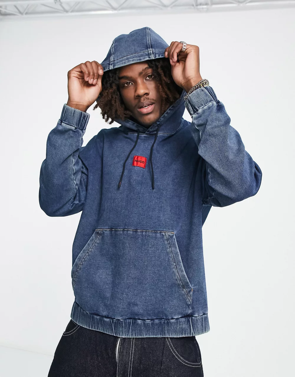 - HUGO 020 relaxed fit denim hoodie in medium blue