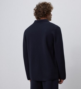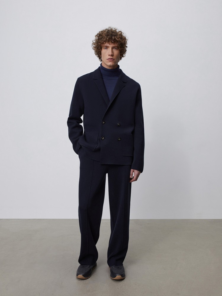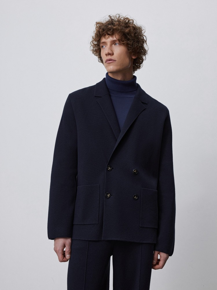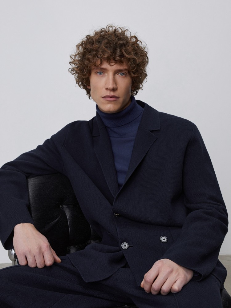 Темно-синий пиджак с классической двубортной застежкой получился комфортным, как кардиган. Модель связали из дышащего хлопка и согревающей шерсти без добавления подкладки, поэтому в пиджаке не жарко и удобно двигаться. С помощью сложной технологии переплетения нитей удалось получить плотный и малорастяжимый трикотаж, который визуально напоминает текстиль.Сделано в Китае.