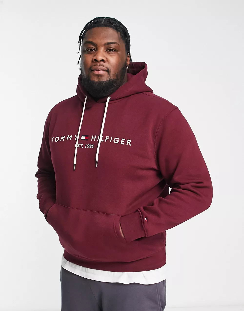 - Tommy Hilfiger Big & Tall embroidered logo cotton blend hoodie in burgundy