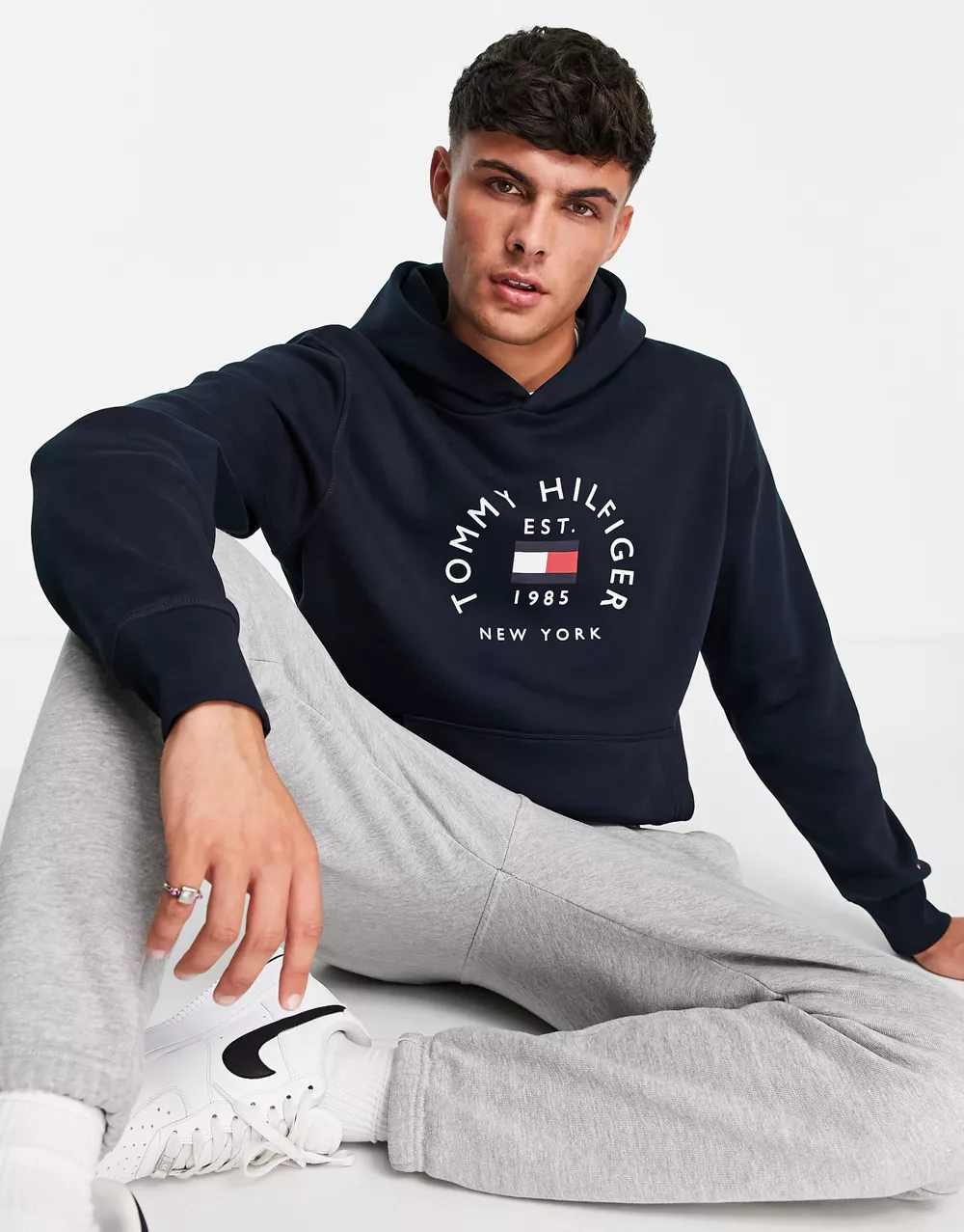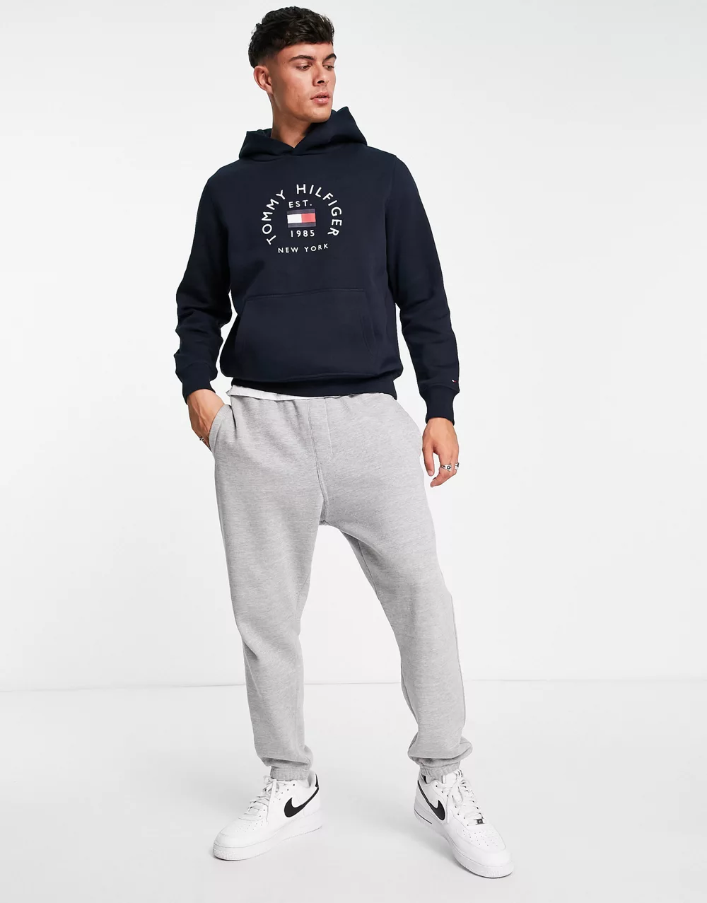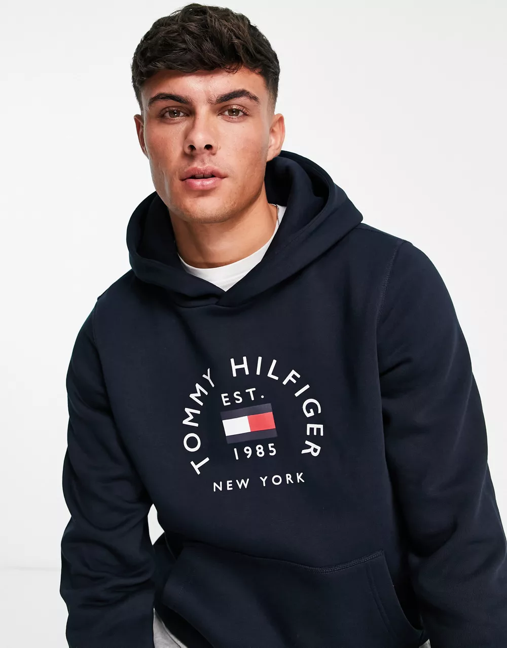 - Tommy Hilfiger flag arch logo cotton blend hoodie in navy