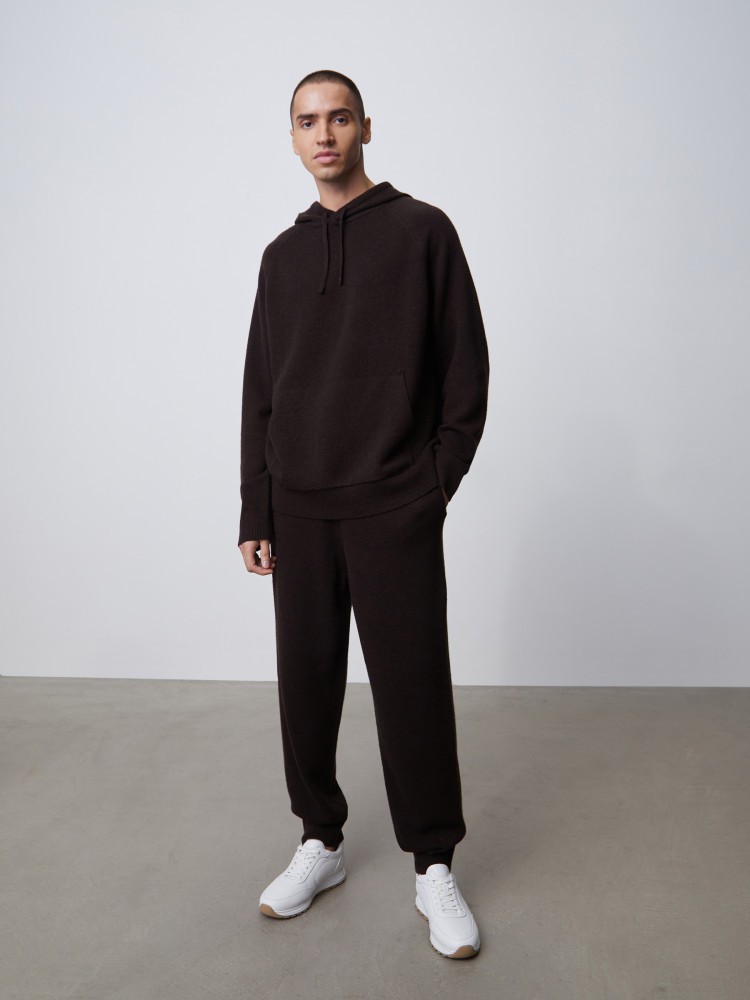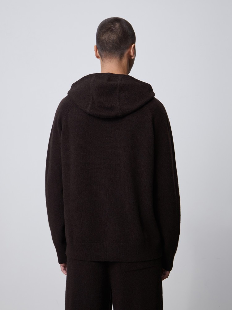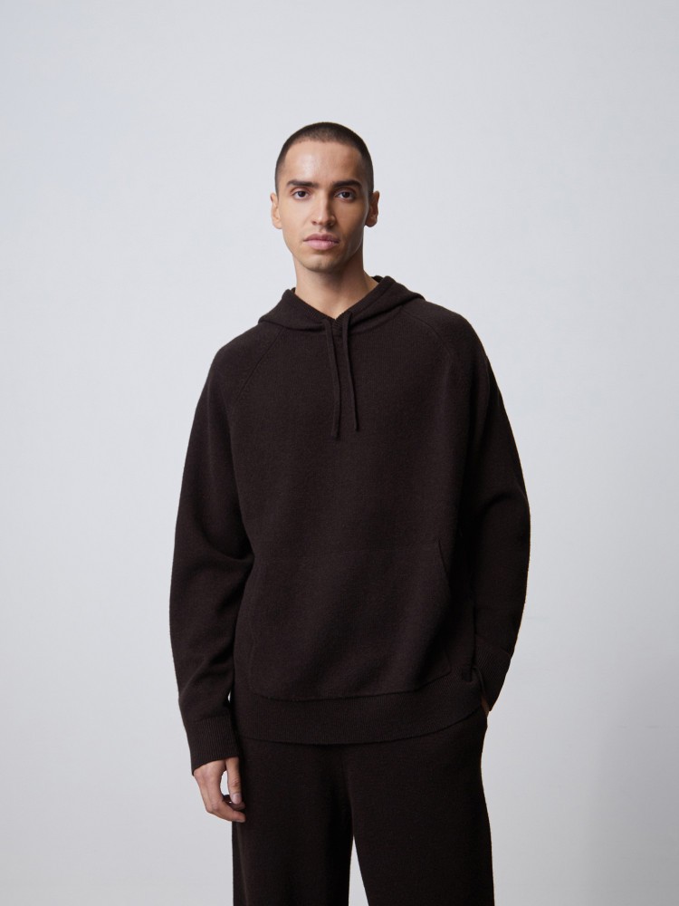 Вязаное худи — расслабленная версия джемпера, альтернатива спортивным толстовкам. Худи связали из шерсти мериноса, которую сделали еще мягче и нежнее с помощью волокон кашемира. Эта теплая и слегка пушистая нить отличается природной эластичностью: если вы храните худи на полке, складки на нем быстро разглаживаются, а само оно хорошо сохраняет форму. При трении о шершавые поверхности трикотаж может скатываться — в таком случае, пожалуйста, удаляйте пилли с помощью машинки по уходу за шерстью.