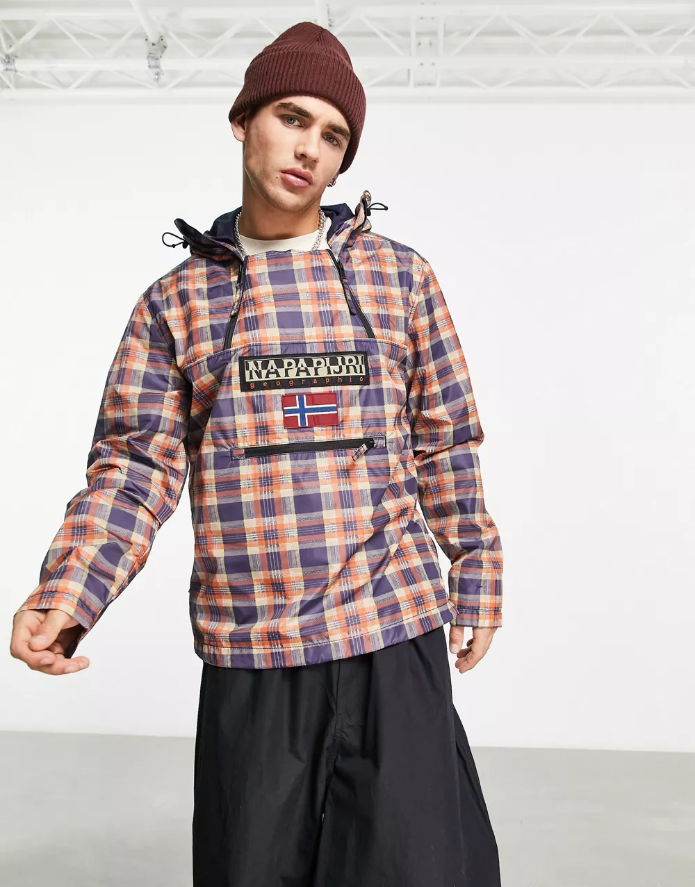 - Napapijri x Liberty Northfarer check print hooded jacket in brown and blue
