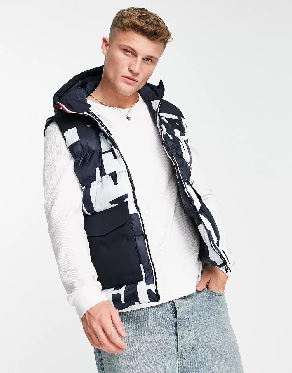 - Tommy Hilfiger padded gilet in blue Hilfiger print