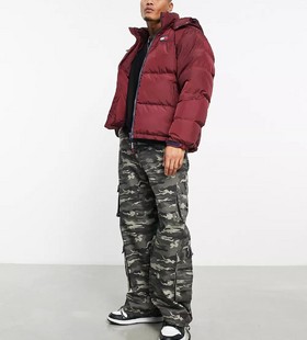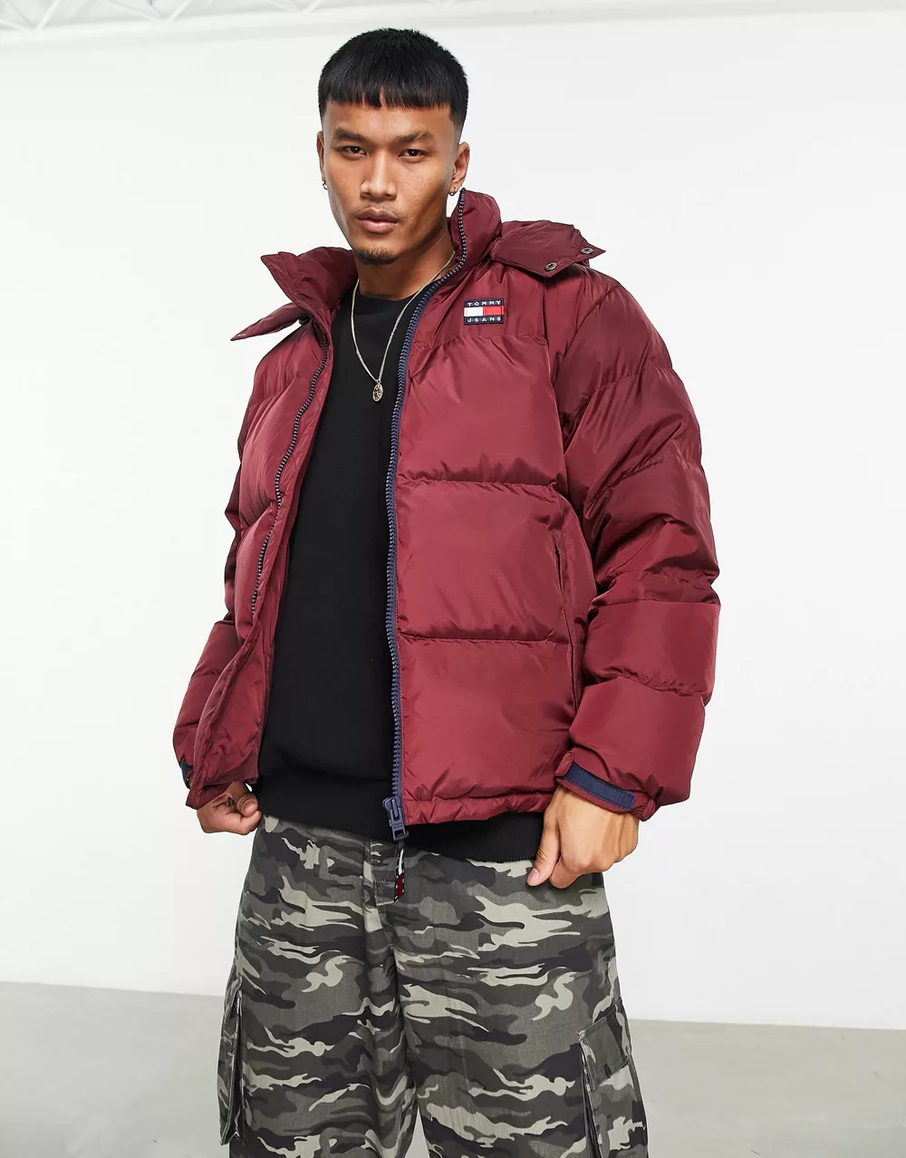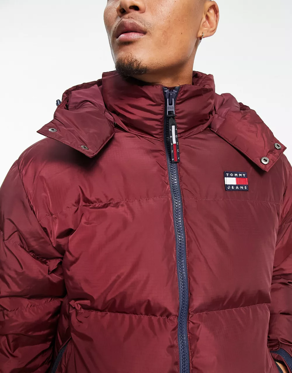 - Tommy Jeans alaska flag logo detatchable hood down puffer jacket in burgundy