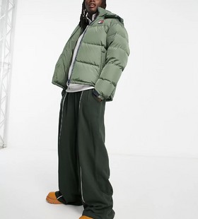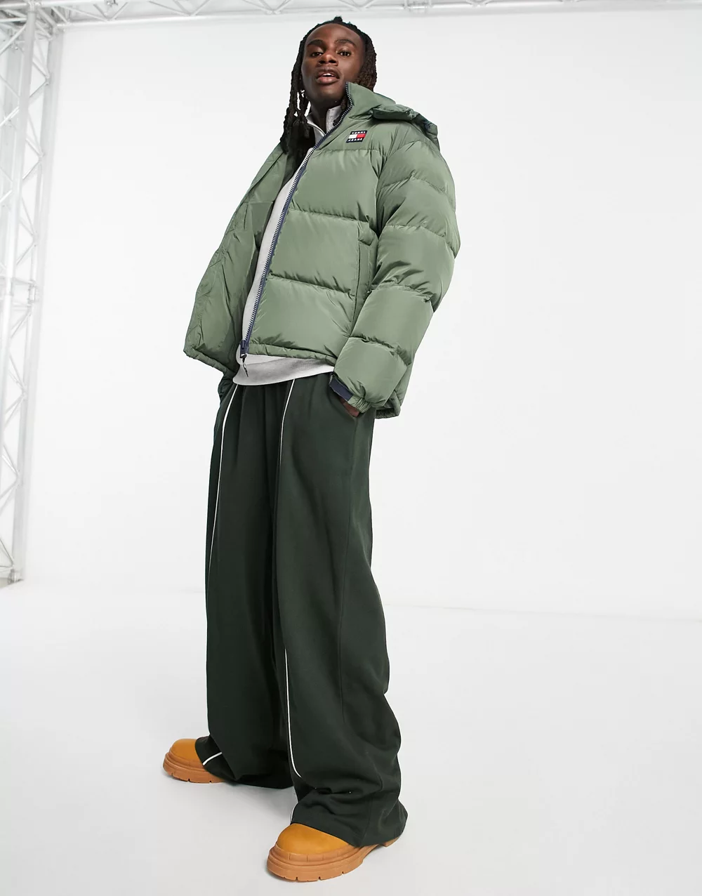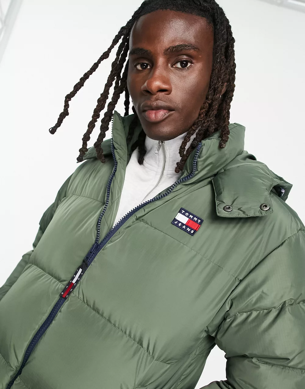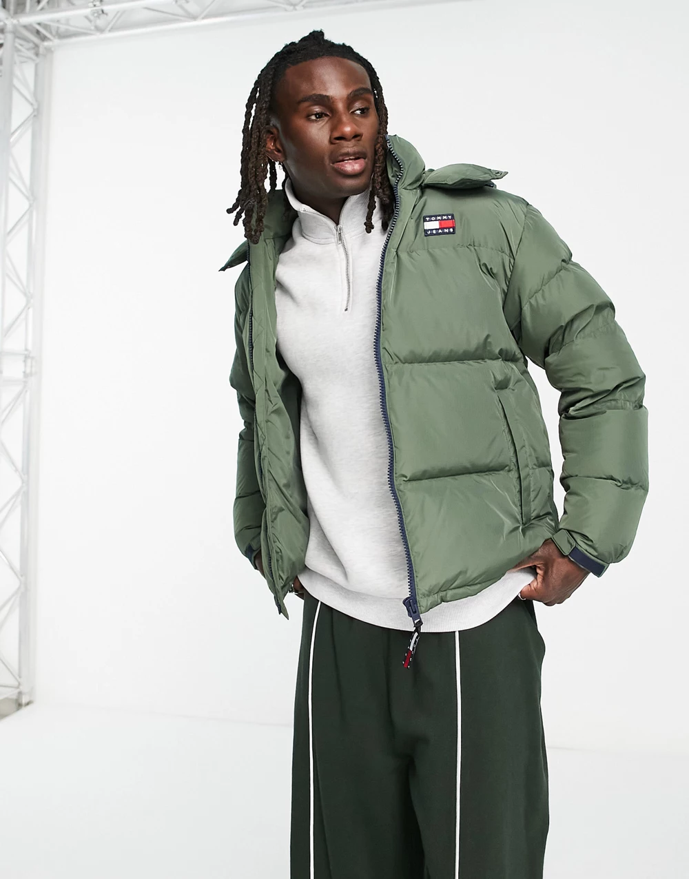 - Tommy Jeans alaska flag logo detatchable hood down puffer jacket in green